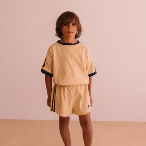 We Are Kids SS26 clean and sporty everyday set in a versatile sand tone, featuring a relaxed-fit tee and matching shorts with contrast detailing. Available now at Togs Moments.