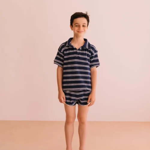 A classic navy striped set with polo-style top and matching shorts, perfect for a smart yet casual summer look. Available now at Togs Moments.