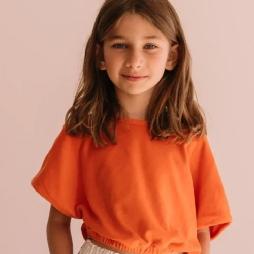 A vibrant coral cropped top with a relaxed fit and elastic hem, perfect for effortless summer styling. Togs Moments.