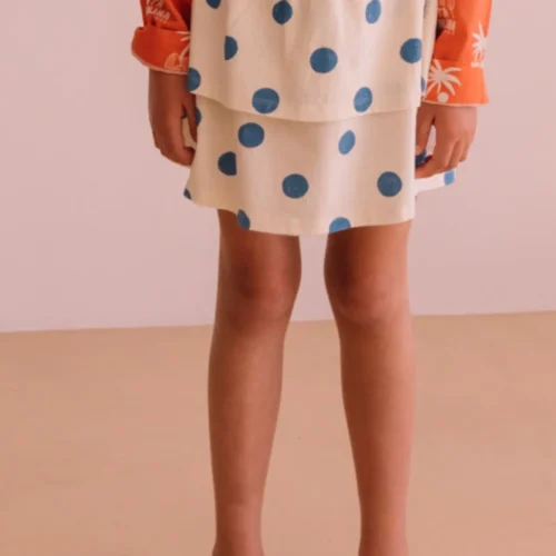 A playful ruffled skirt with blue polka dots and an elastic waistband, perfect for stylish and comfortable summer outfits.