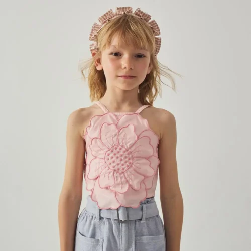 Soft pink halter top with statement floral design and smocked structure. Available now at Togs Moments.
