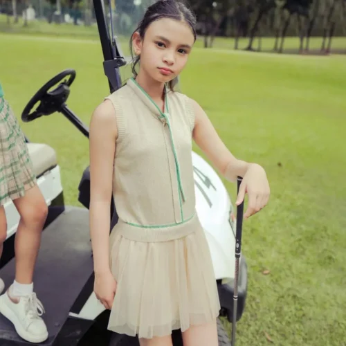 Elegant sleeveless knit top with bow detail paired with a soft layered tulle skirt.