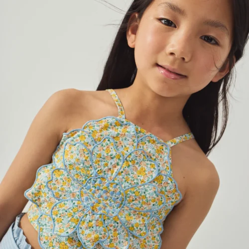 Statement floral halter top with layered flower design in soft blue tones. Available now at Togs Moments.
