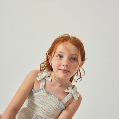 Lightweight girls’ summer set featuring a ruffled top with bow straps and matching shorts. Available now at Togs Moments.