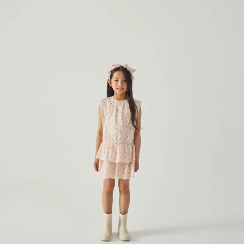 Soft pink floral dress with a layered ruffle skirt, perfect for summer days and special occasions. Available now at Togs Moments.