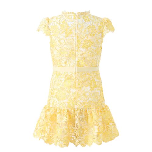 The Cassandra Embroidered Mini Dress by Marlo is a charming occasion dress featuring delicate floral embroidery in a soft yellow tone. Designed with elegant cap sleeves, a fitted bodice, and a playful frill hem, this girls’ mini dress is perfect for parties, weddings, and summer celebrations.