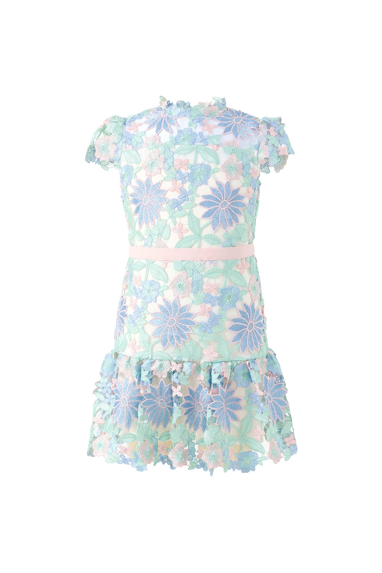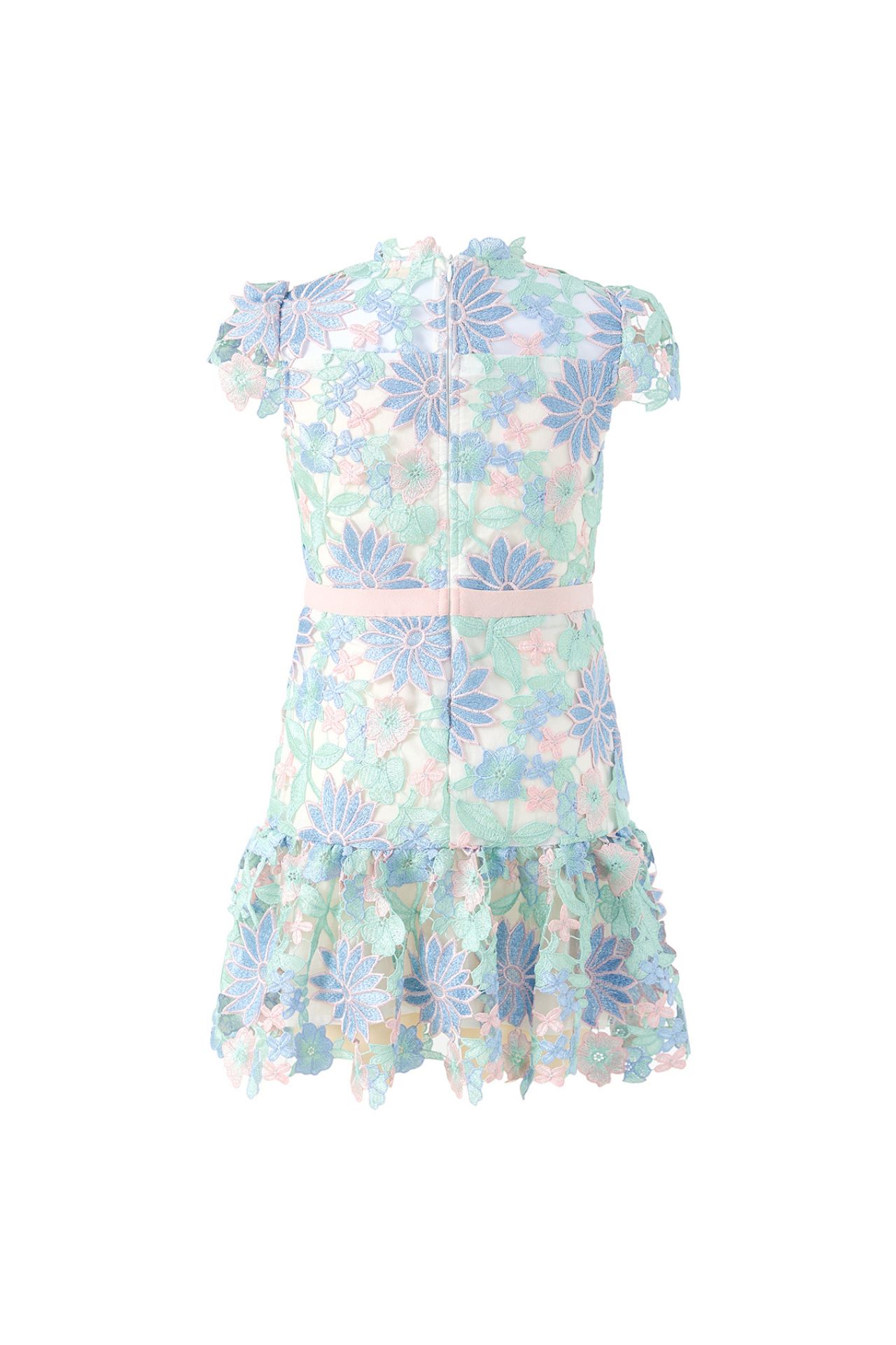 The fitted bodice highlights the detailed embroidery, while the soft cap sleeves add a romantic touch. A subtle waistline accent enhances the silhouette before flowing into a lightly flared mini skirt finished with a delicate frill hem. The result is an elegant yet youthful dress that is perfect for weddings, birthday parties, family celebrations, and festive occasions.
