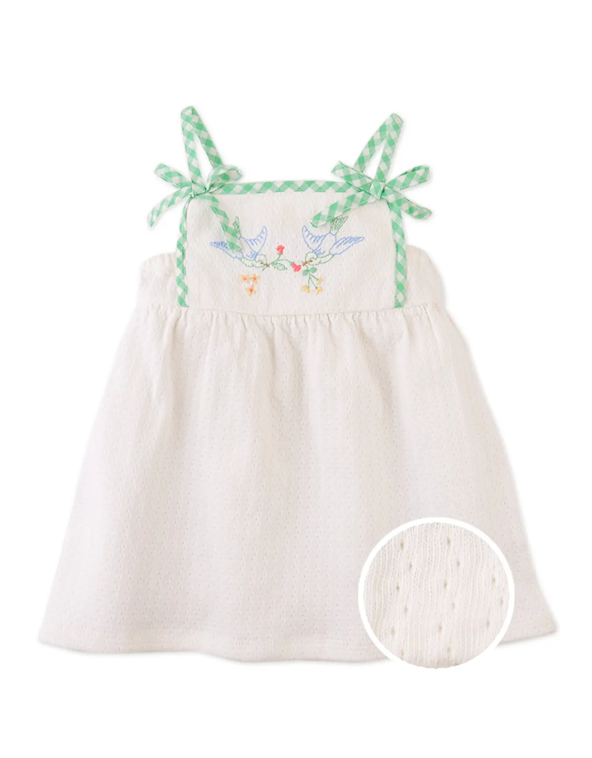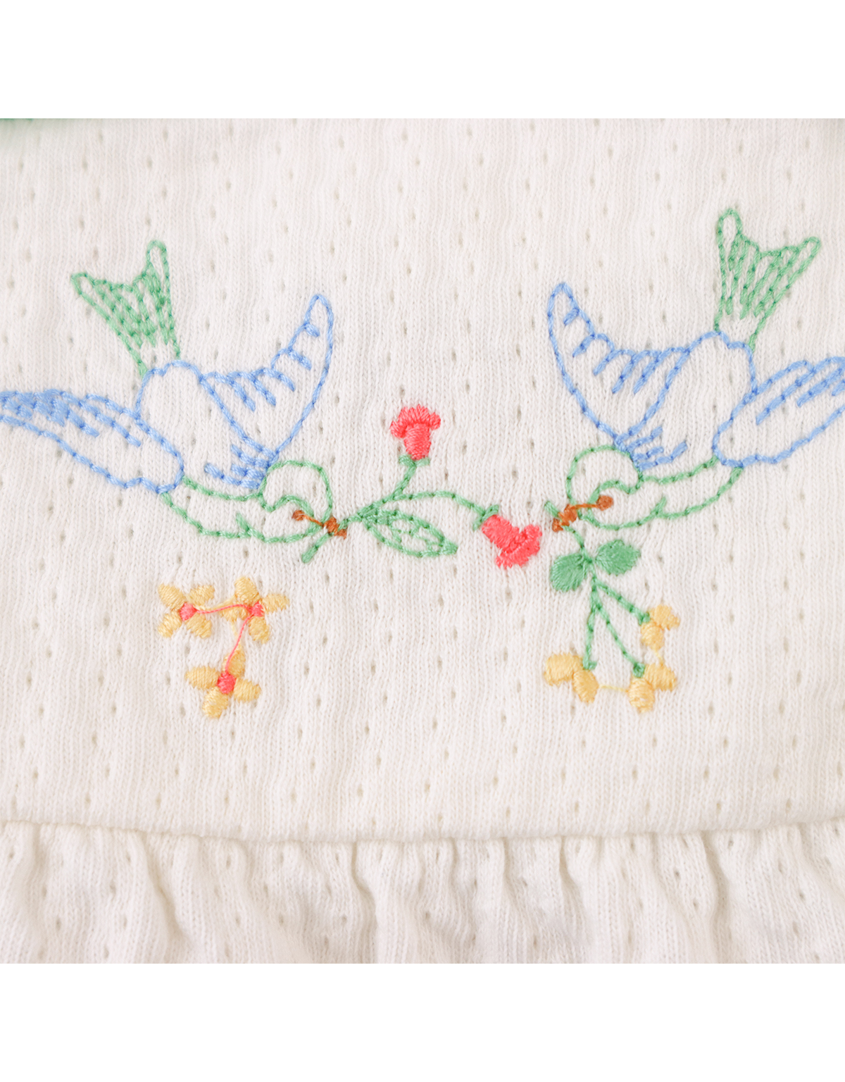 The bodice is adorned with charming embroidery of birds and floral details, creating a sweet and timeless look. The adjustable shoulder straps tied into bows add both functionality and a playful touch, while the soft silhouette allows for easy movement.