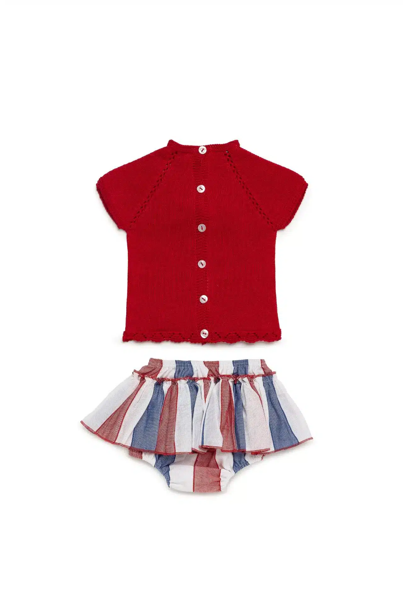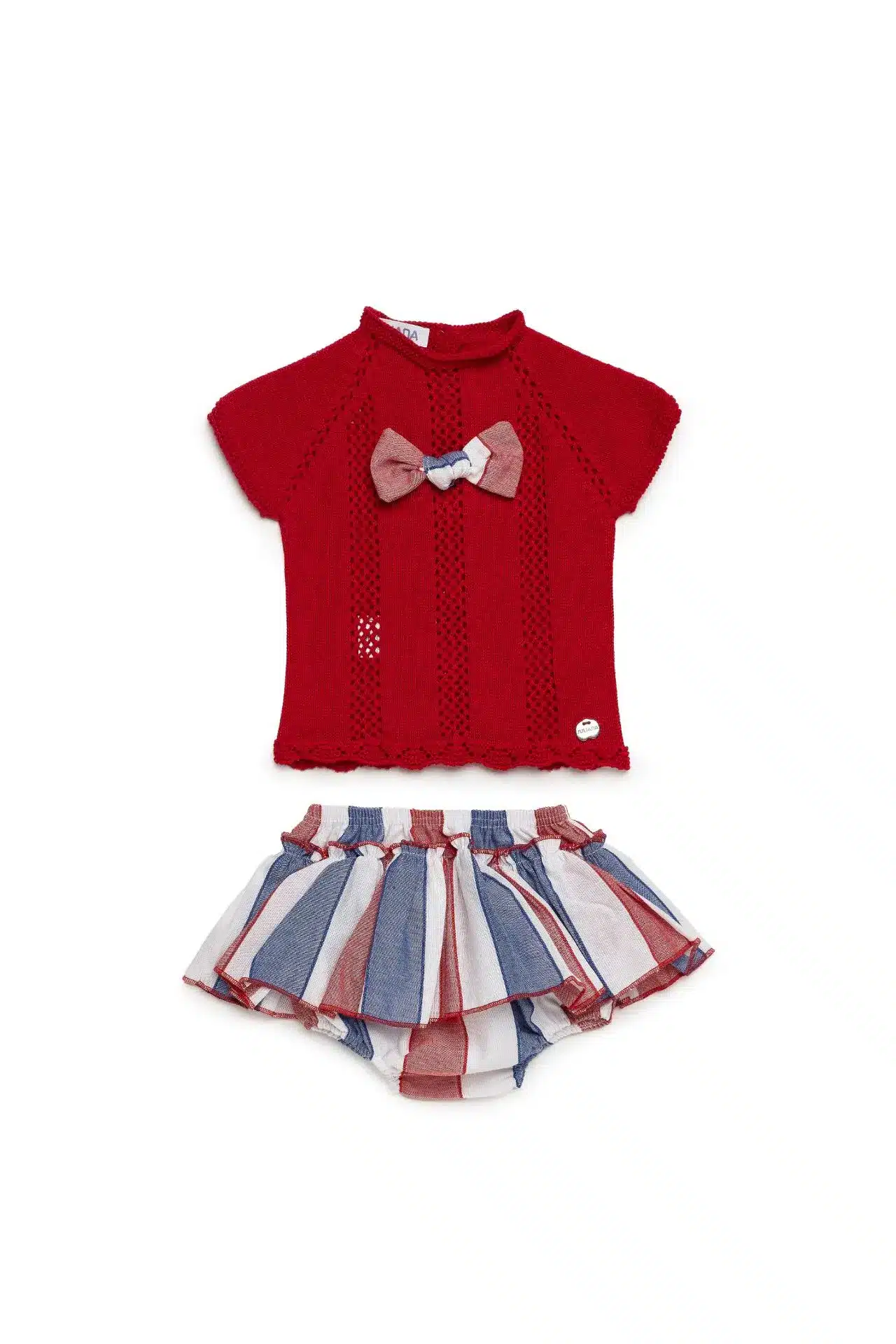 Dress your little one in timeless elegance with the Baby Girl Knit Striped Set from Juliana Vistiendo Bebés SS26. This charming outfit features a beautifully crafted red knit top paired with striped skirt-style bloomers, creating a perfect blend of classic and playful style.