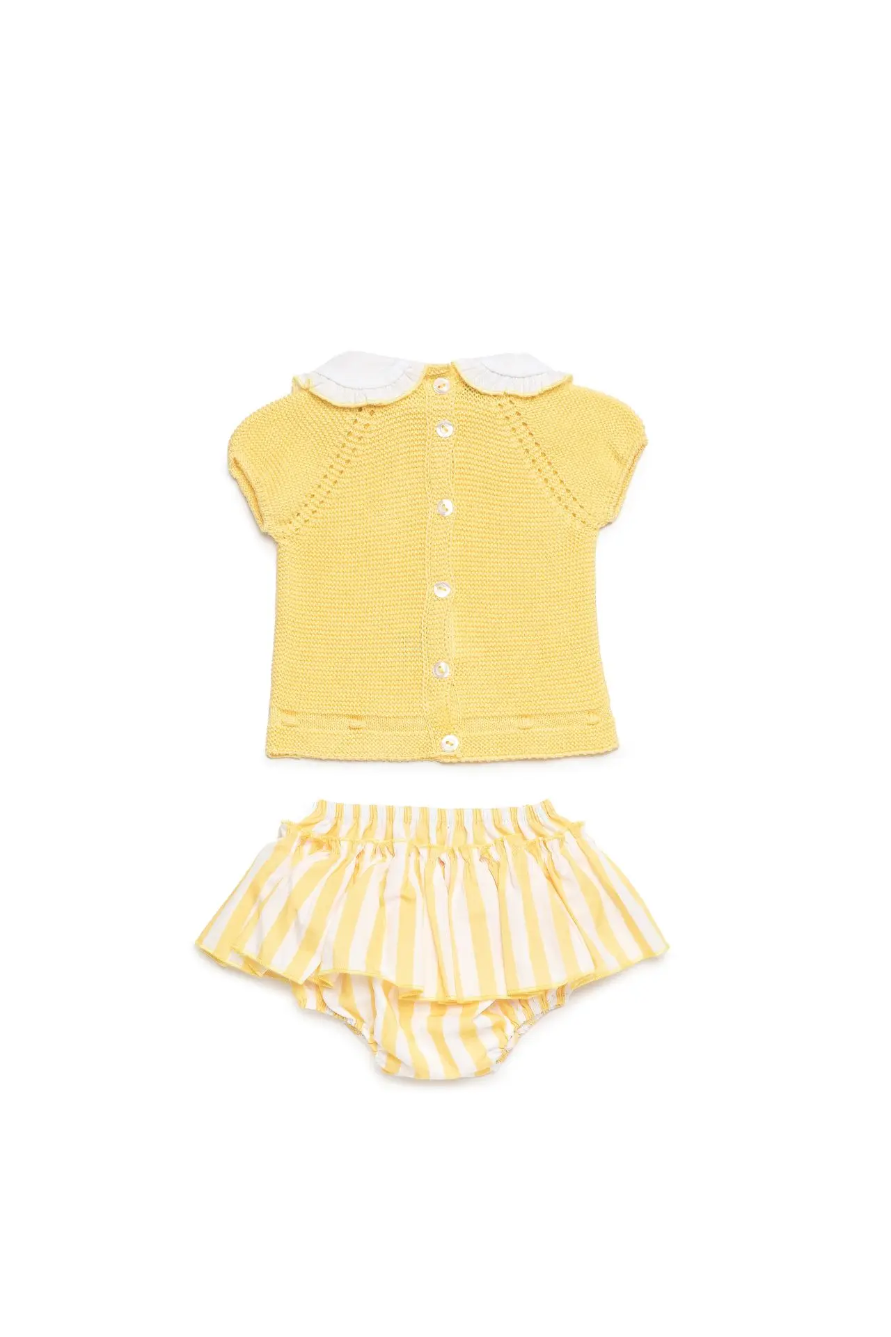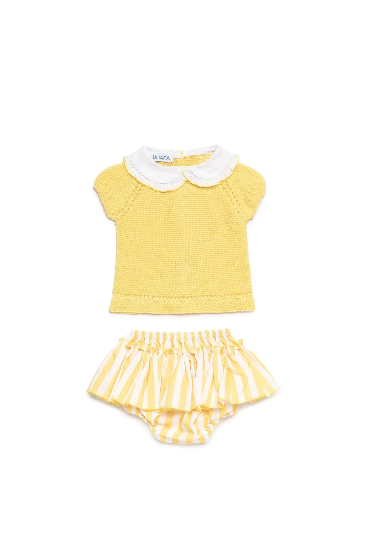 The knit top features a delicate textured finish in a soft yellow tone, complemented by a classic white collar that adds a refined touch. The matching bloomers are designed with subtle yellow and white stripes and a gentle ruffle overlay, bringing movement and charm to the outfit.