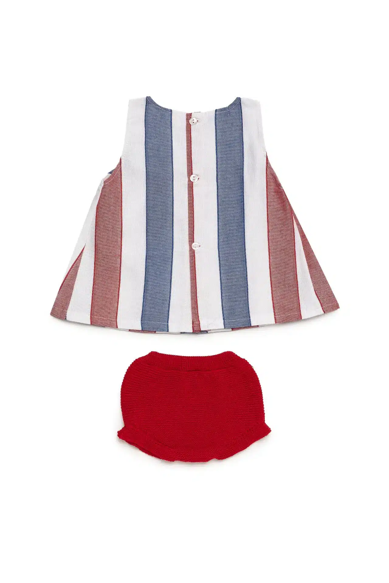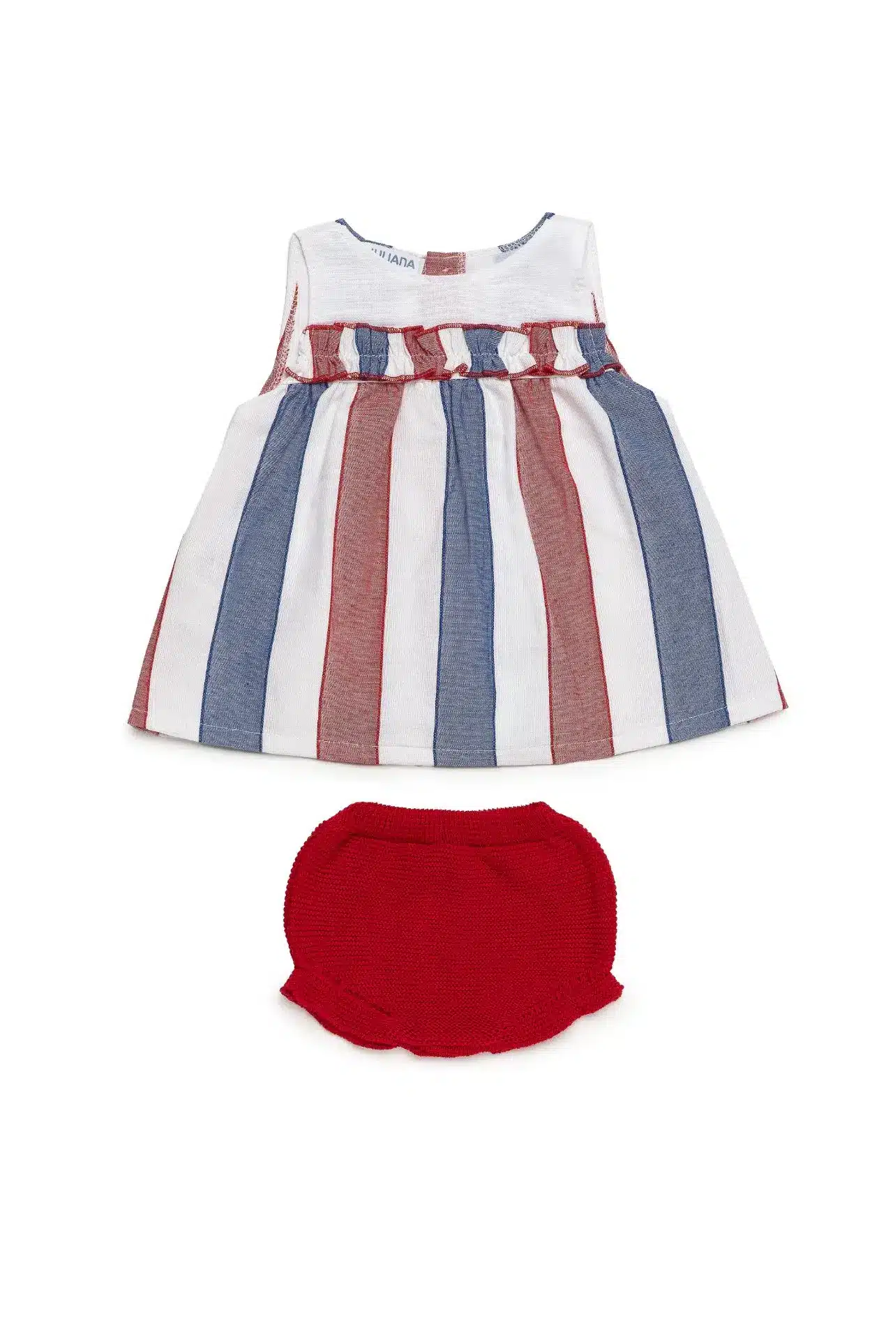 The dress is designed with delicate vertical stripes in soft red, blue, and white tones, enhanced with subtle ruffle detailing across the chest for an added touch of charm. The matching knit bloomers in rich red complete the outfit, ensuring both comfort and style for your little one.