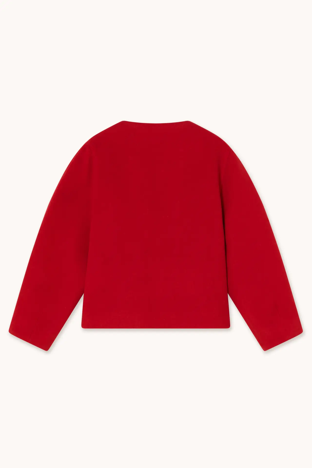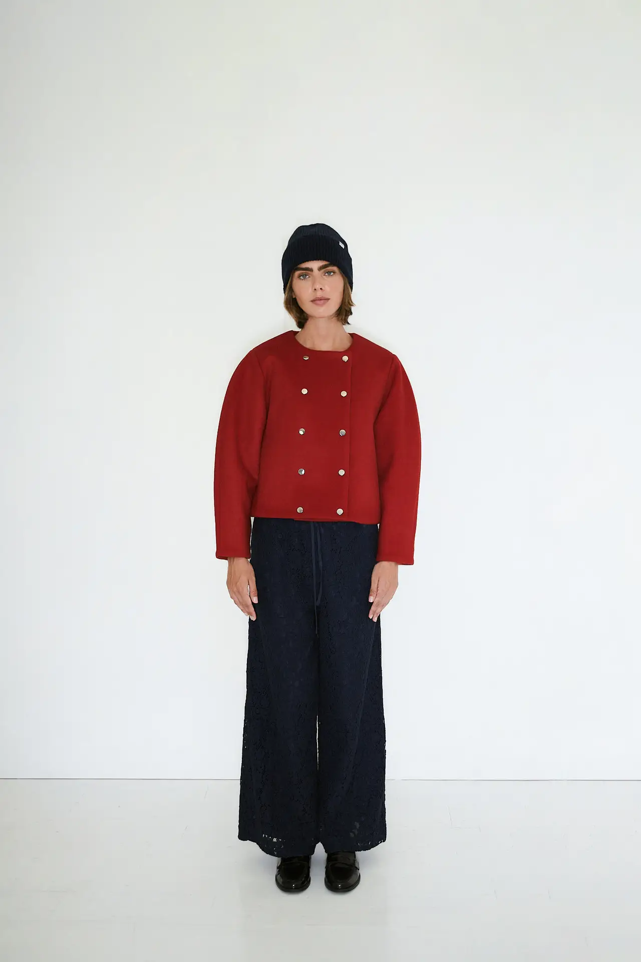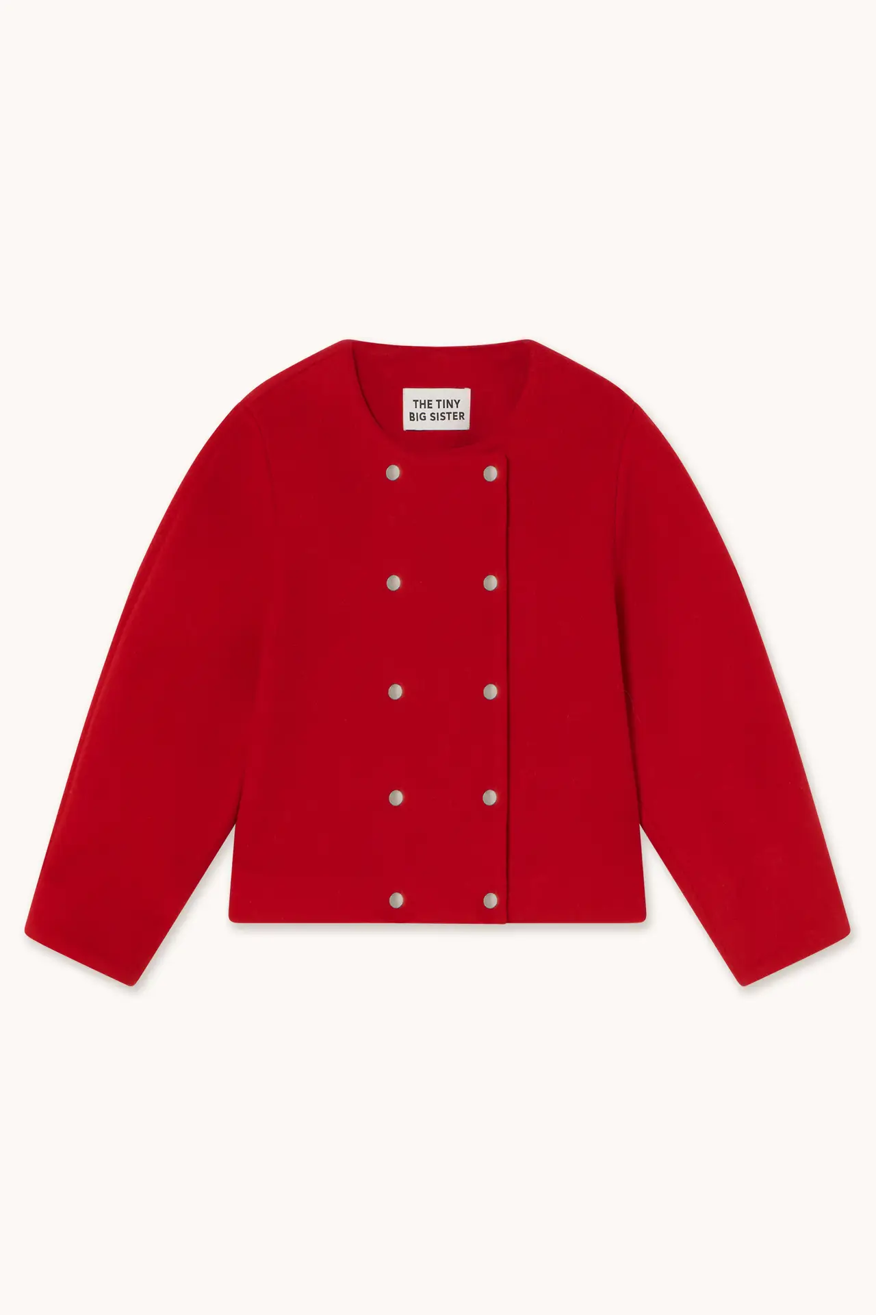 This short coat is tailored from a warm wool-blend fabric in a rich deep red hue. It features a double-breasted front with silver-tone snap buttons and voluminous, structured sleeves for a modern silhouette. Fully lined for added comfort and ease of layering.