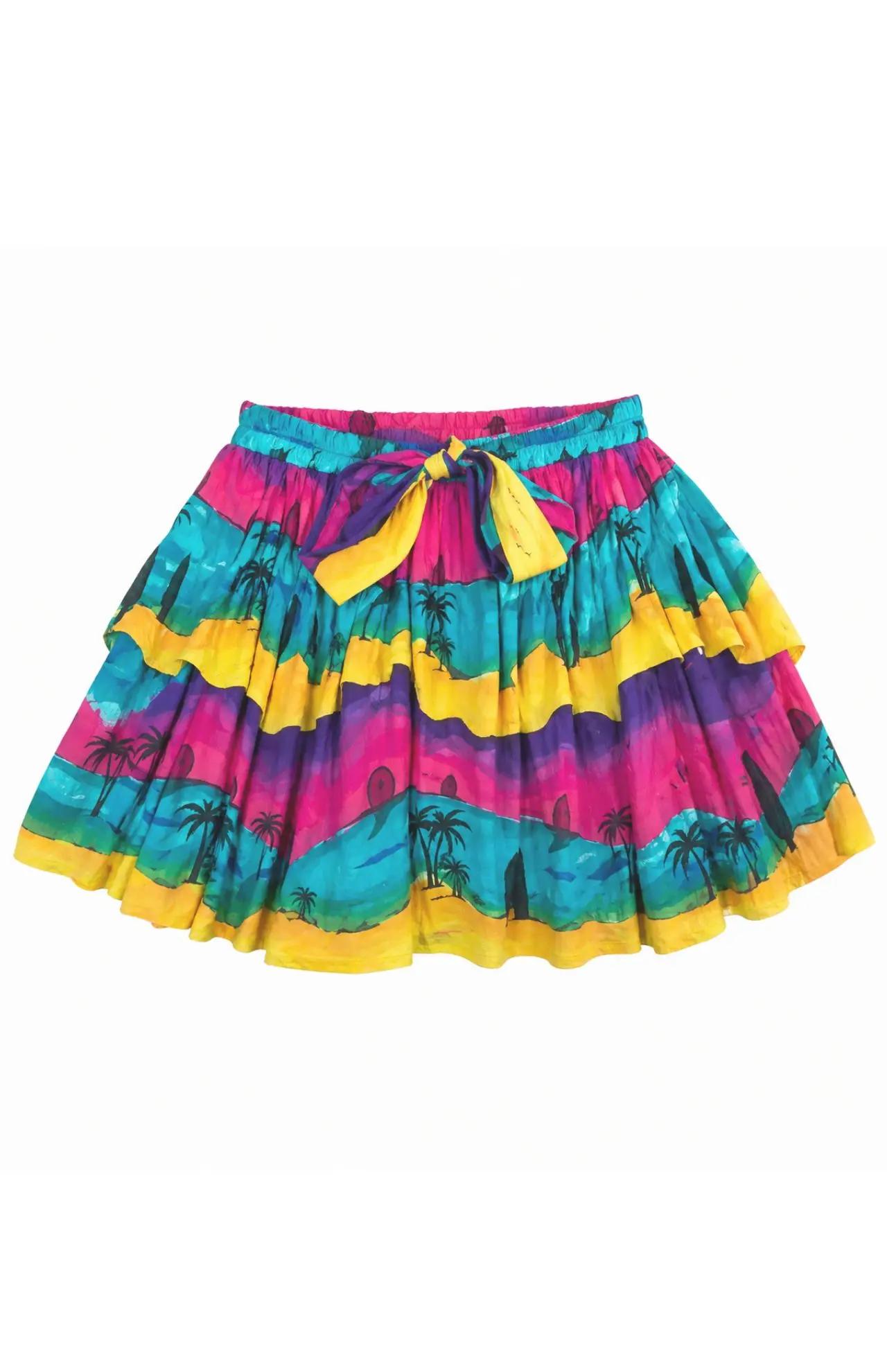 Designed with a stunning rainbow sunset print, this skirt captures the essence of summer with its vibrant colors and playful movement. The lightweight fabric and flowy silhouette create a comfortable, airy feel, perfect for warm days.