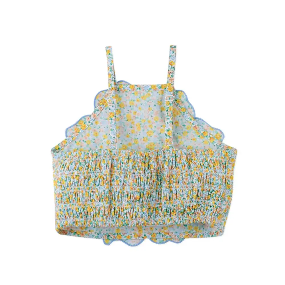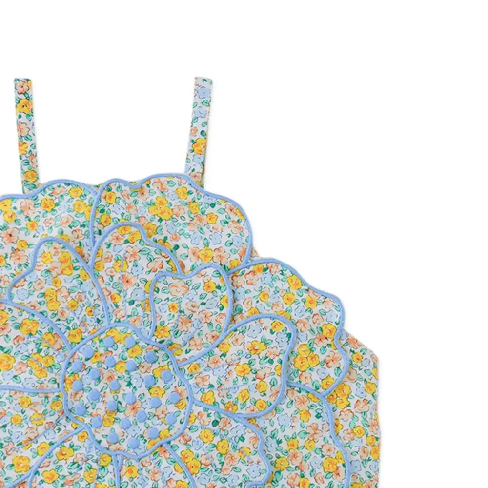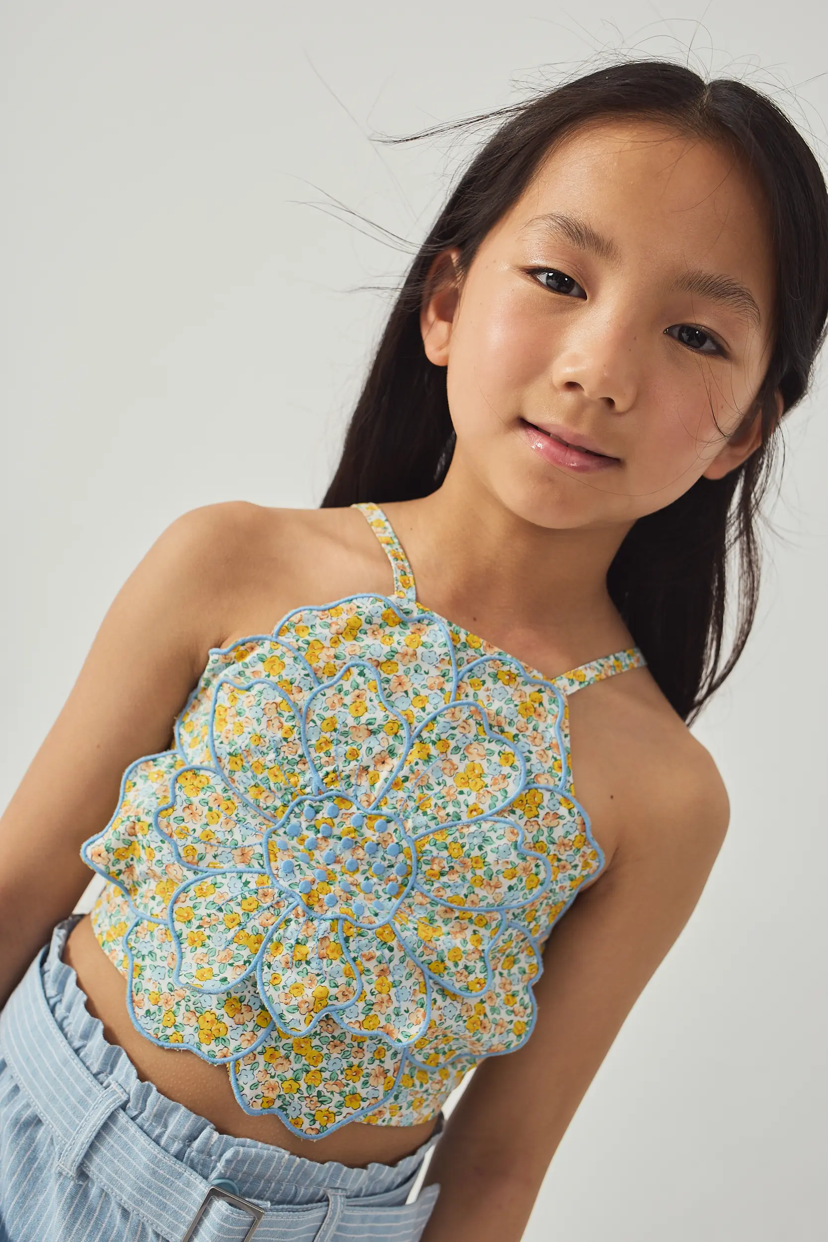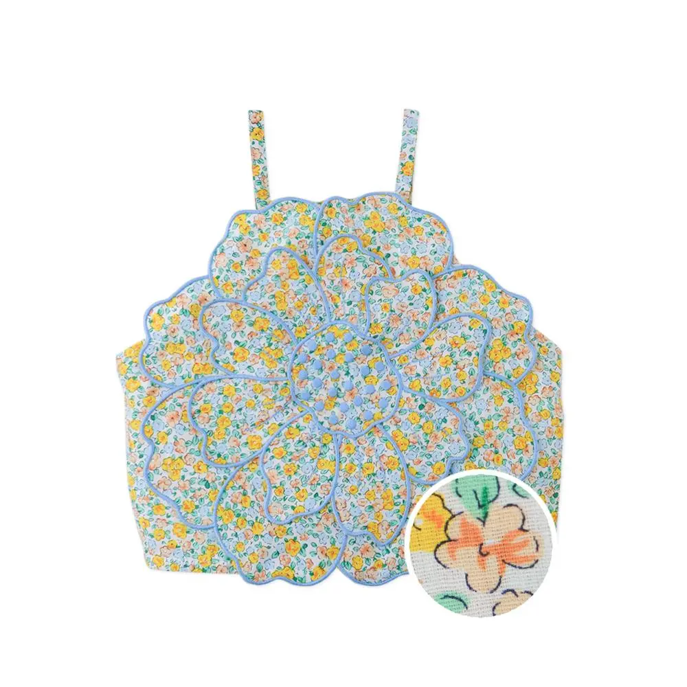 The Eloise Floral Halter Top is a standout summer piece designed to make every outfit unforgettable. Crafted in a soft blue floral print with delicate yellow accents, this top features a unique layered flower silhouette that adds dimension and playful elegance.