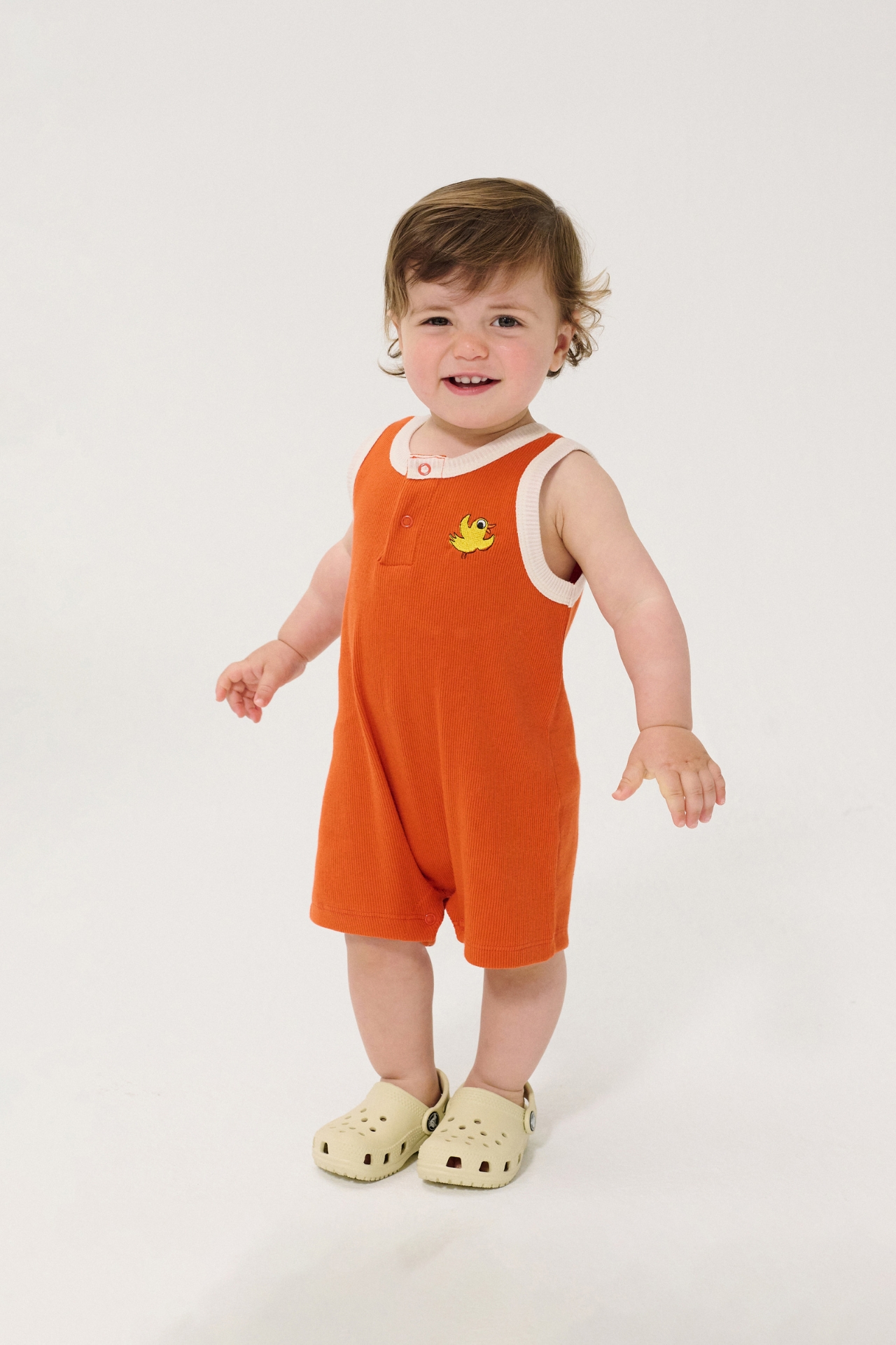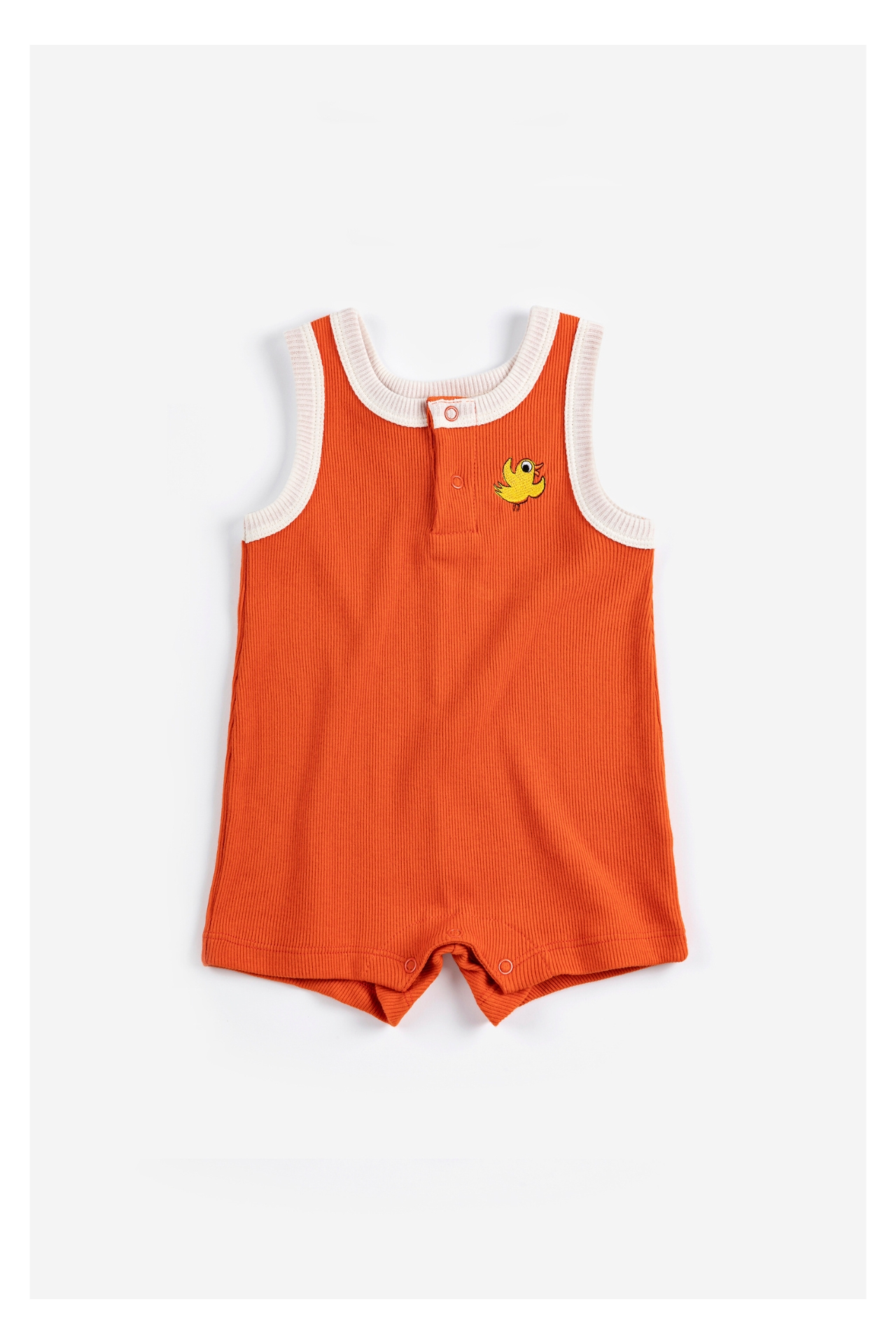 The sleeveless design keeps little ones cool during warm days, while the relaxed silhouette allows easy movement for active play. A small embroidered bird detail on the chest adds a charming touch of personality. Practical snap closures make dressing quick and easy, making this piece both stylish and functional.