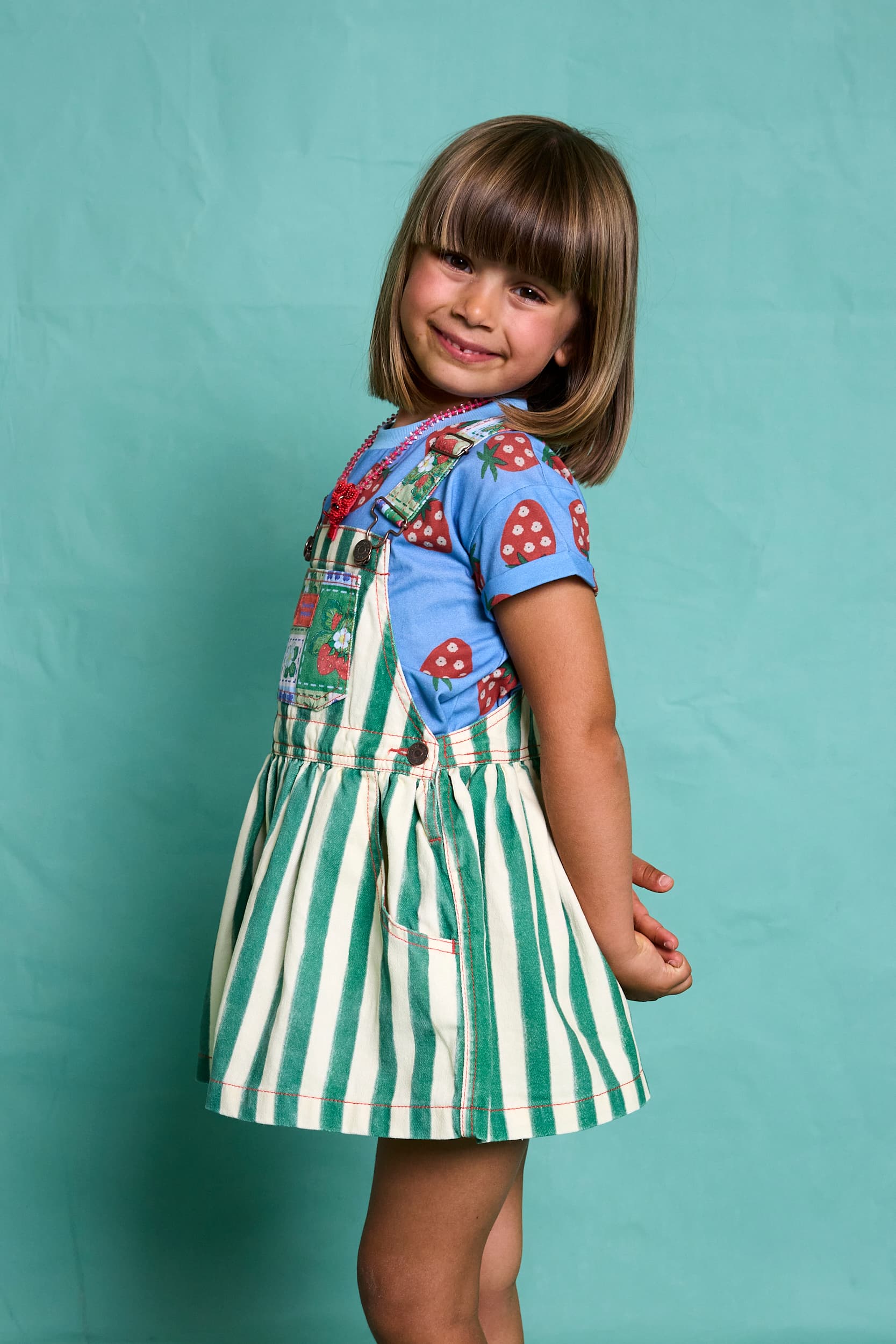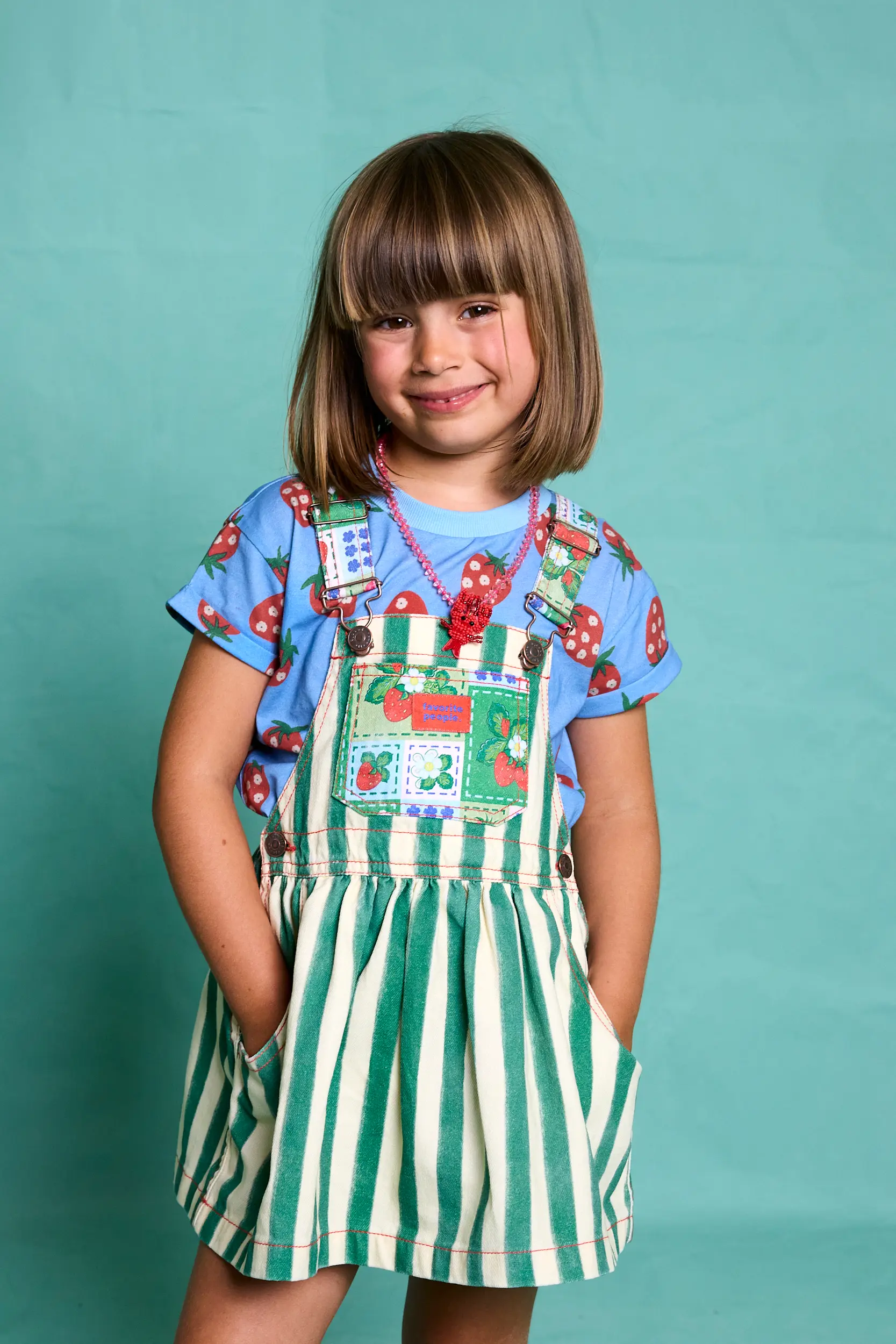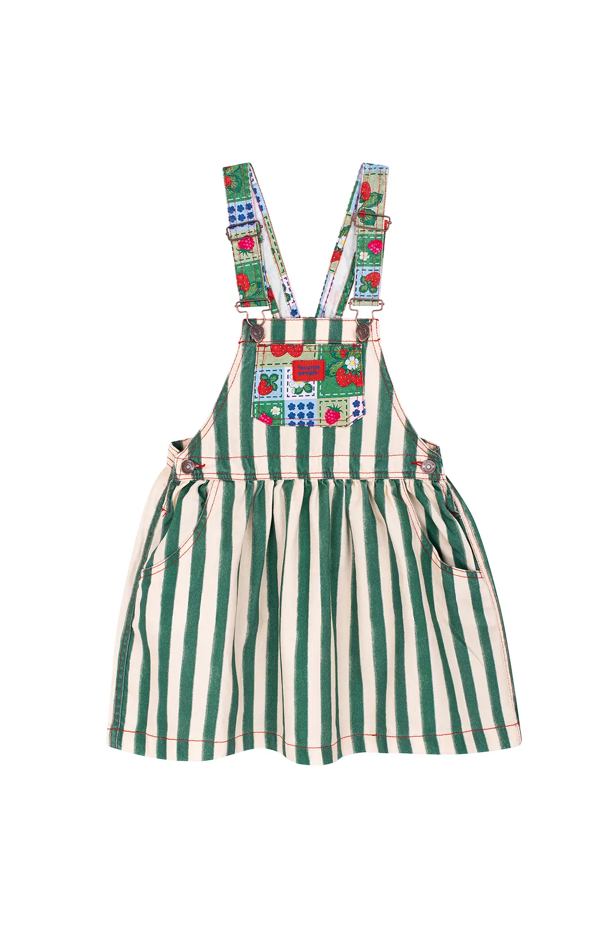 The Fragola Girls Striped Overall Skirt by Favorite People SS26 is a playful and eye-catching piece designed to bring personality to summer wardrobes. Featuring bold green and ecru vertical stripes, this overall skirt is elevated with charming strawberry patchwork details on the front pocket and straps.