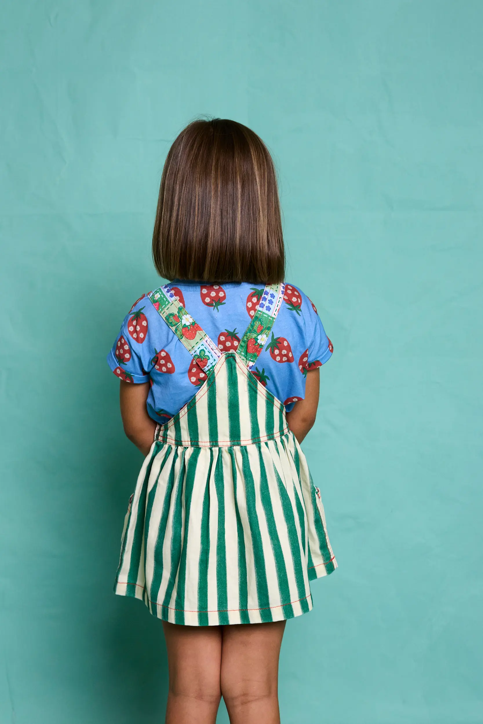 A playful striped overall skirt with unique strawberry detailing.