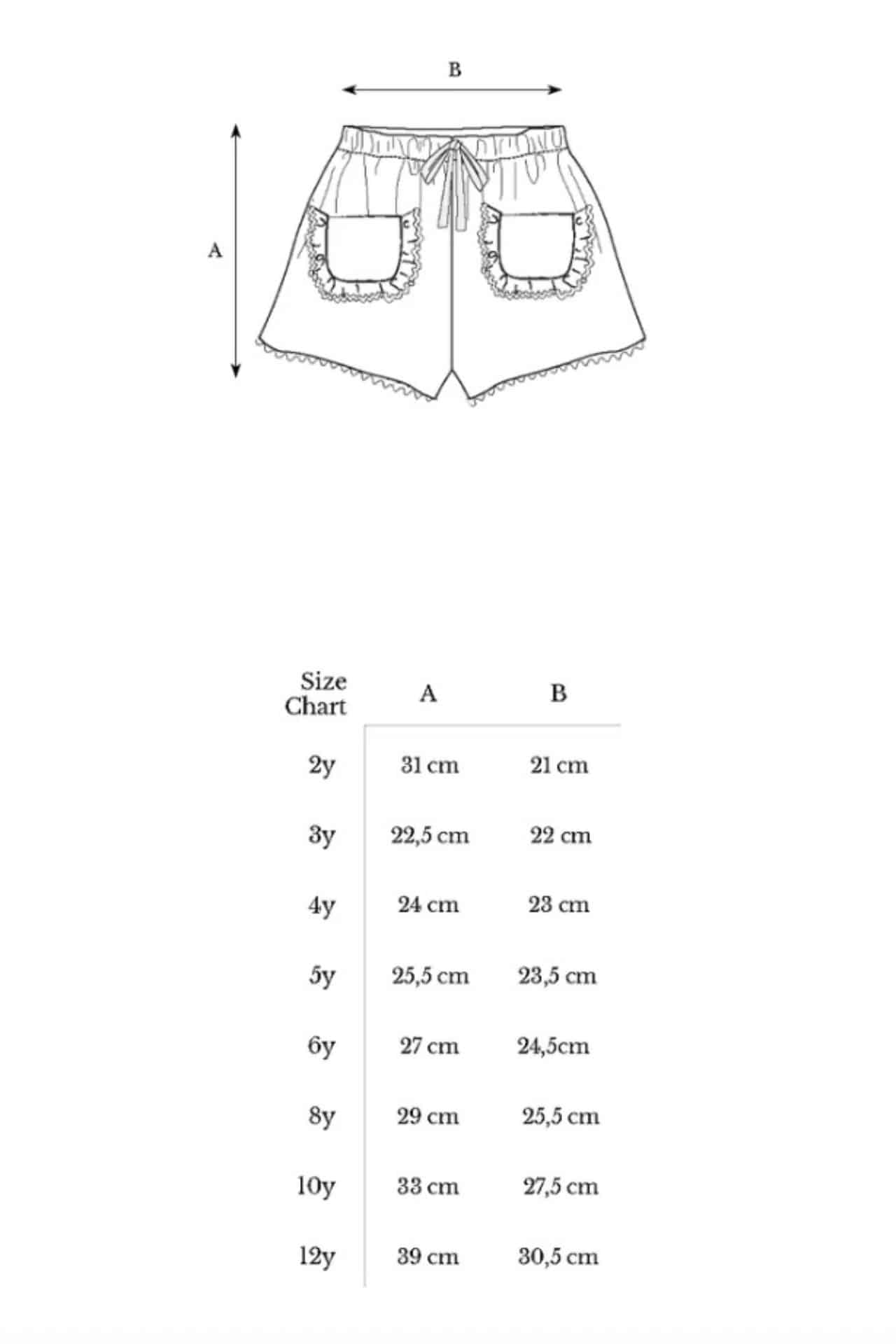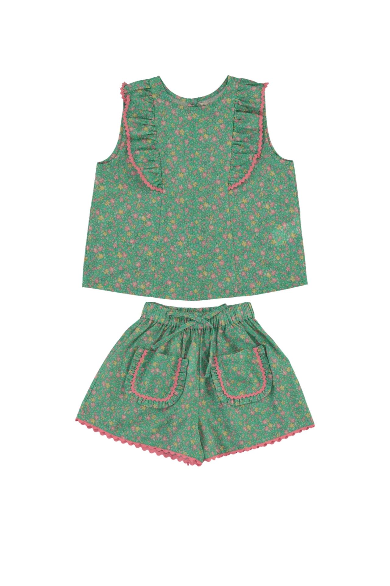The matching shorts feature an elastic waistband for easy wear and are finished with charming front pockets trimmed with subtle ruffles, creating a coordinated and stylish outfit.