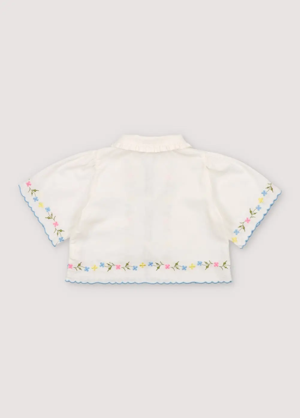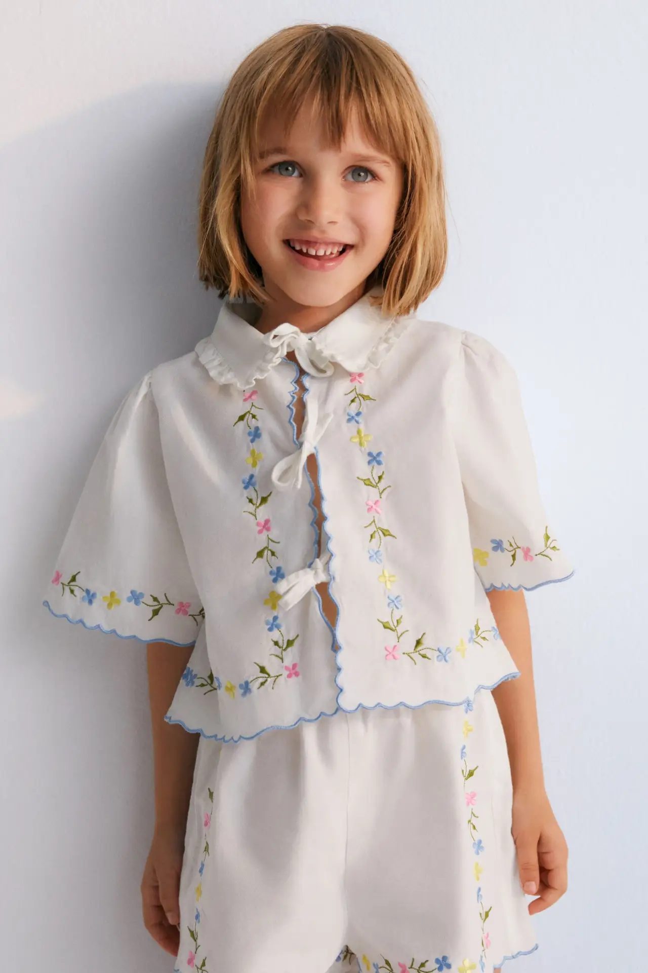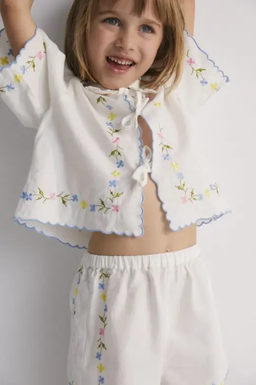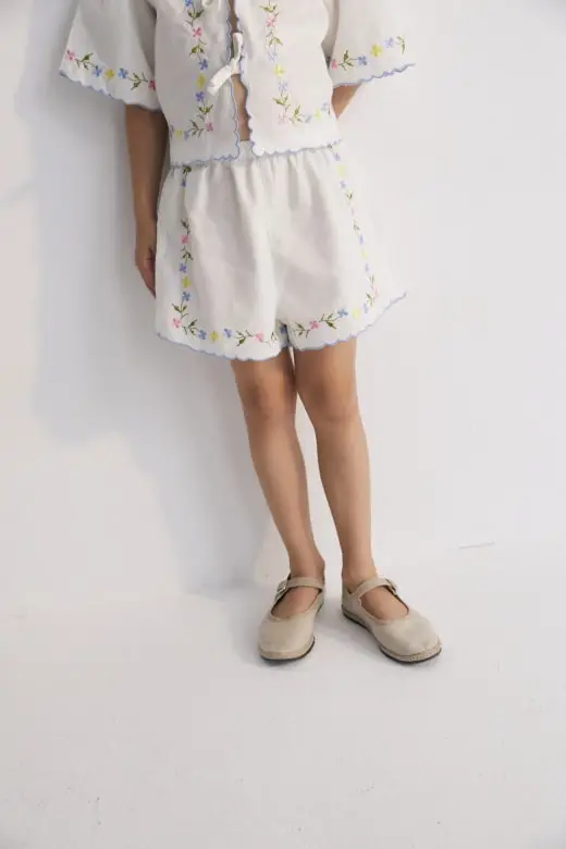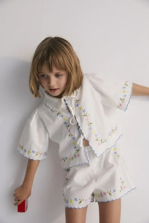 Hermione Set in 100% white cotton baize fabric with flower embroidery. Short-sleeved blouse, shirt collar, and central opening with bows, flower embroideries, and powder blue embroidery detail for the finishes.