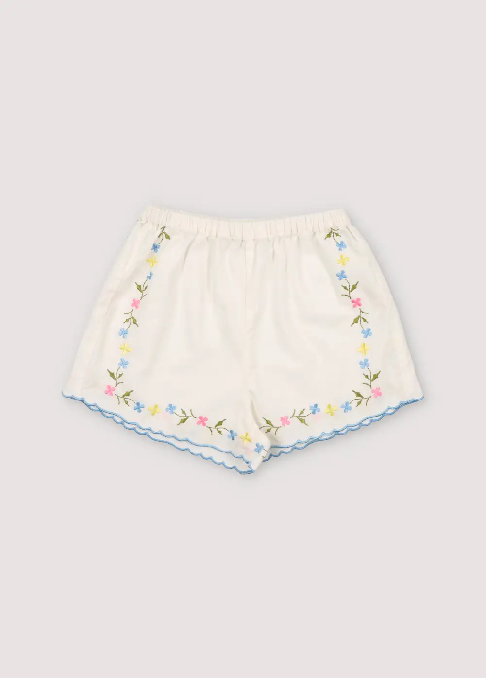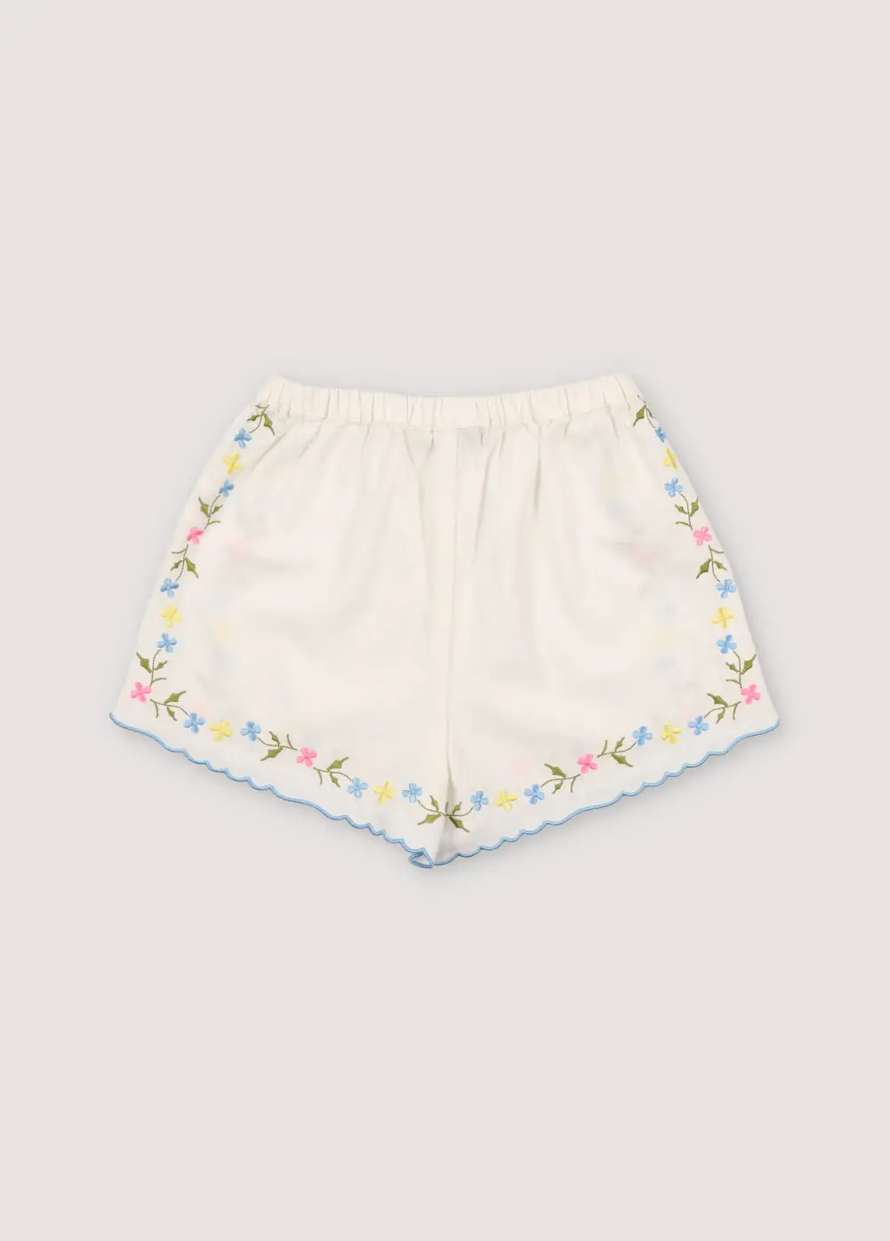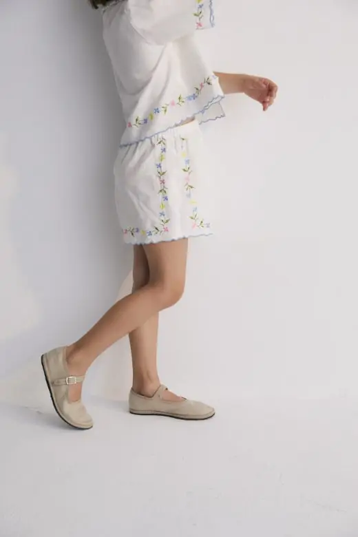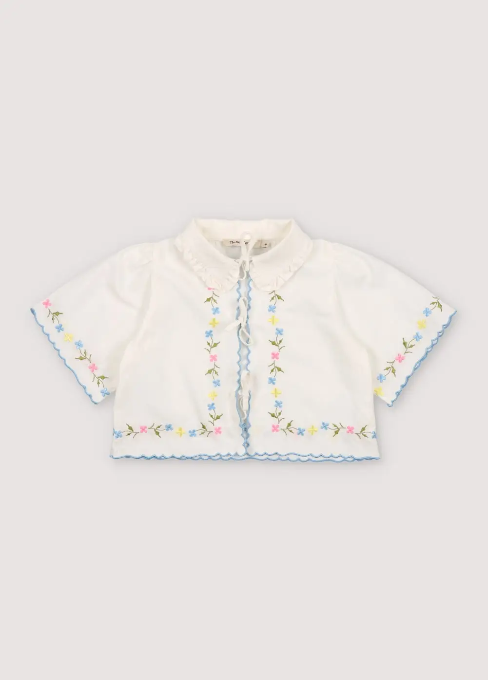 Hermione Set in 100% white cotton baize fabric with flower embroidery. Short-sleeved blouse, shirt collar, and central opening with bows, flower embroideries, and powder blue embroidery detail for the finishes.