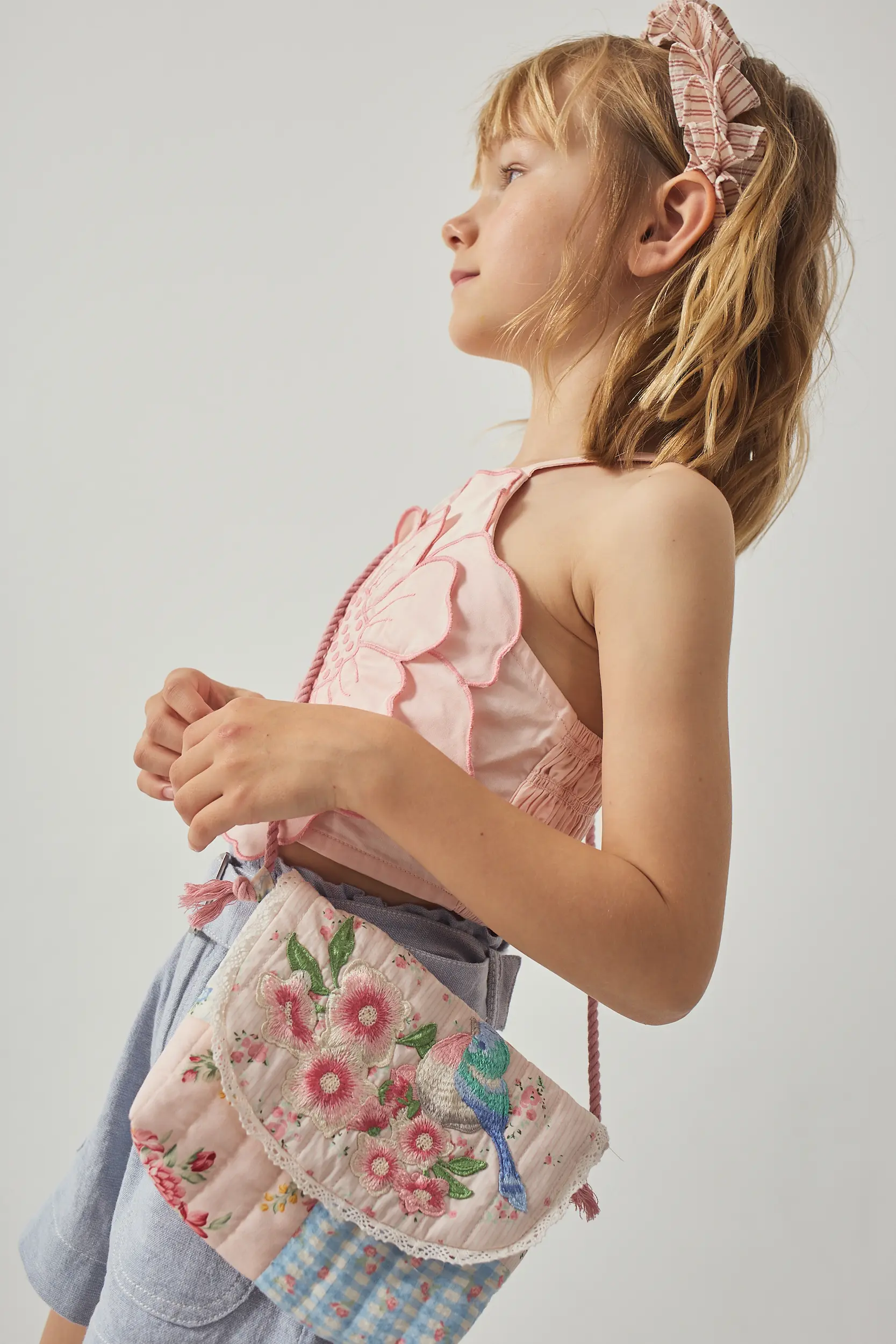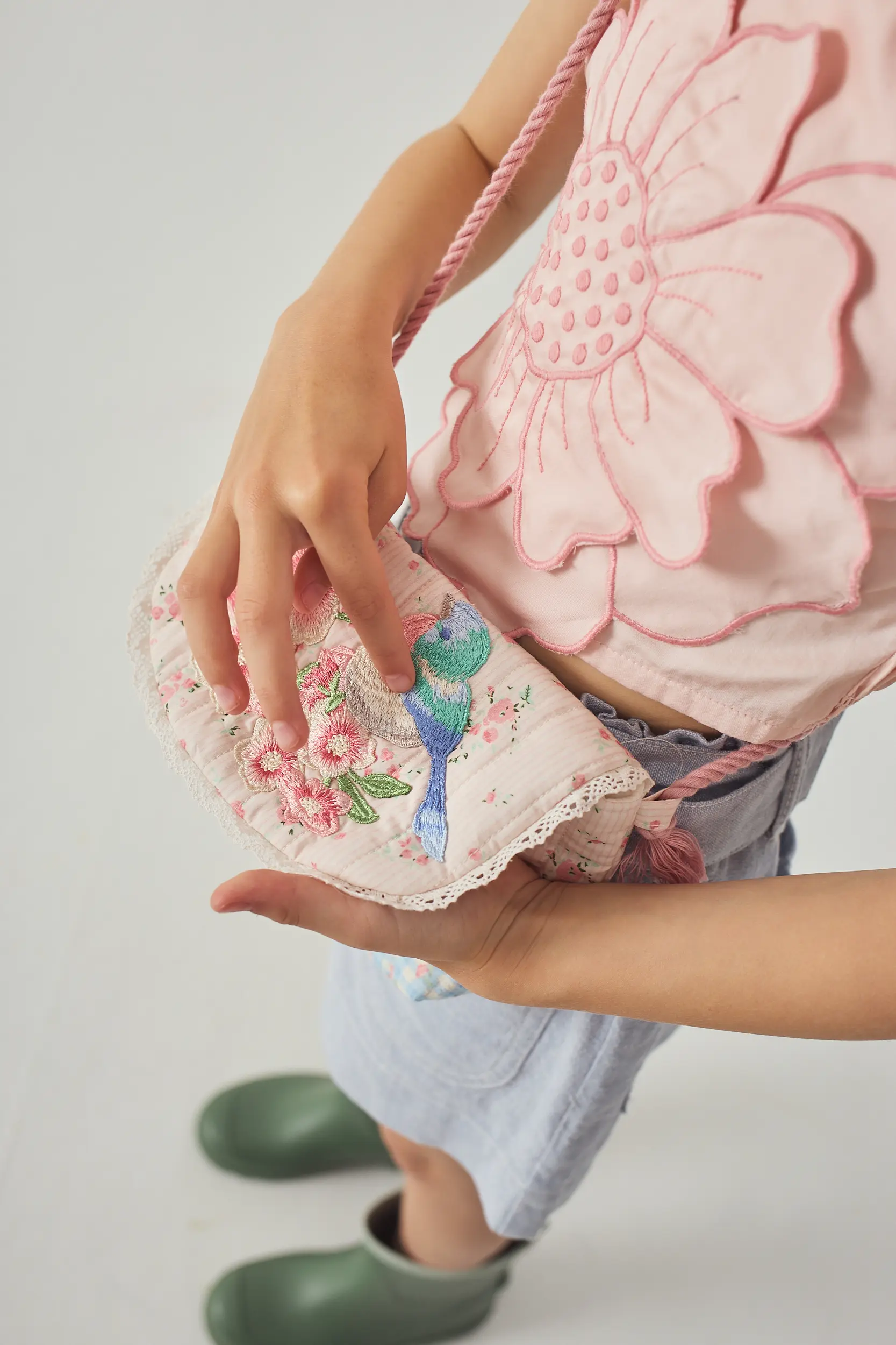 The front flap is adorned with intricate floral embroidery and a playful bird detail, creating a unique handcrafted feel. The soft fabric construction makes it lightweight and comfortable, while the crossbody strap allows for easy, hands-free wear.