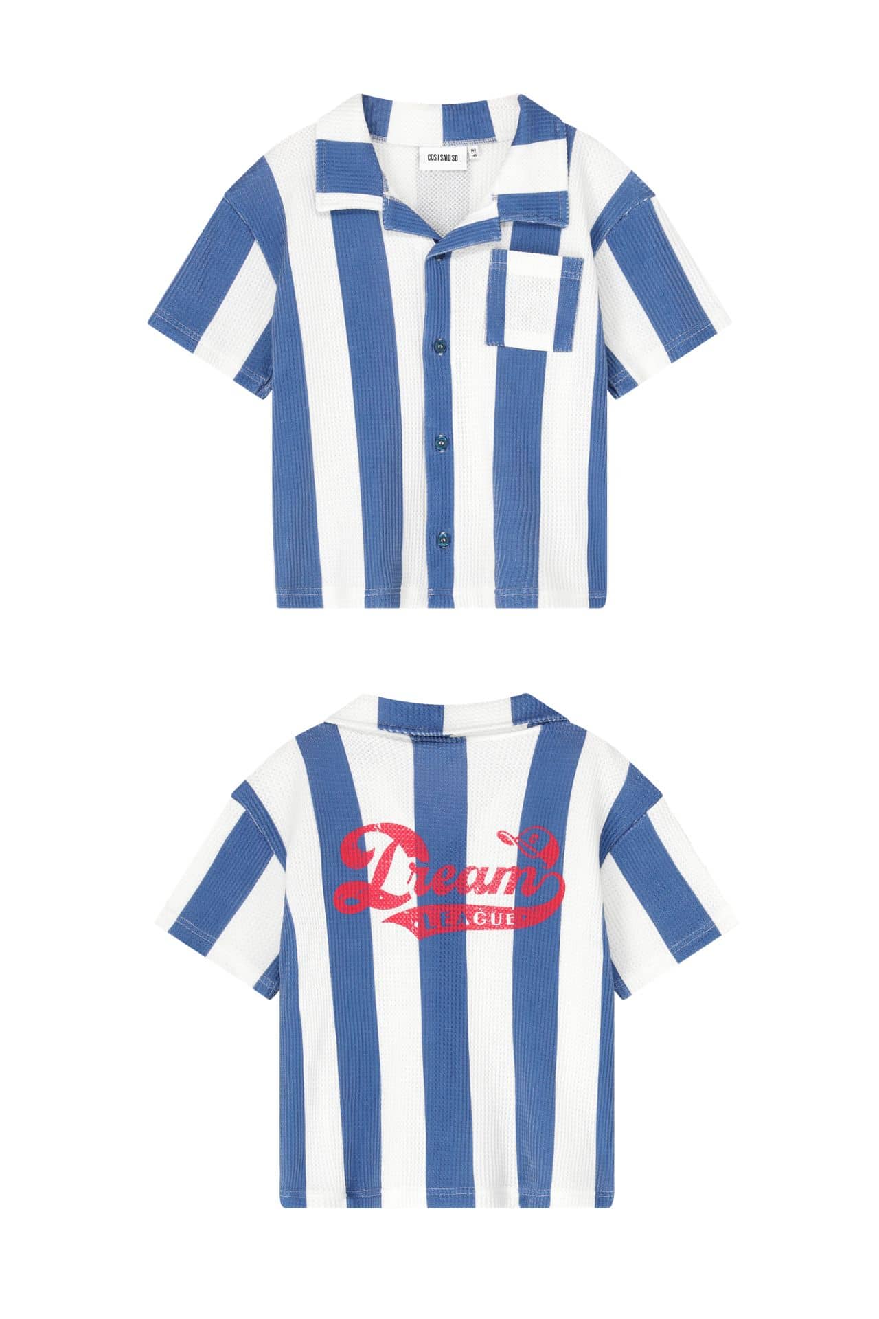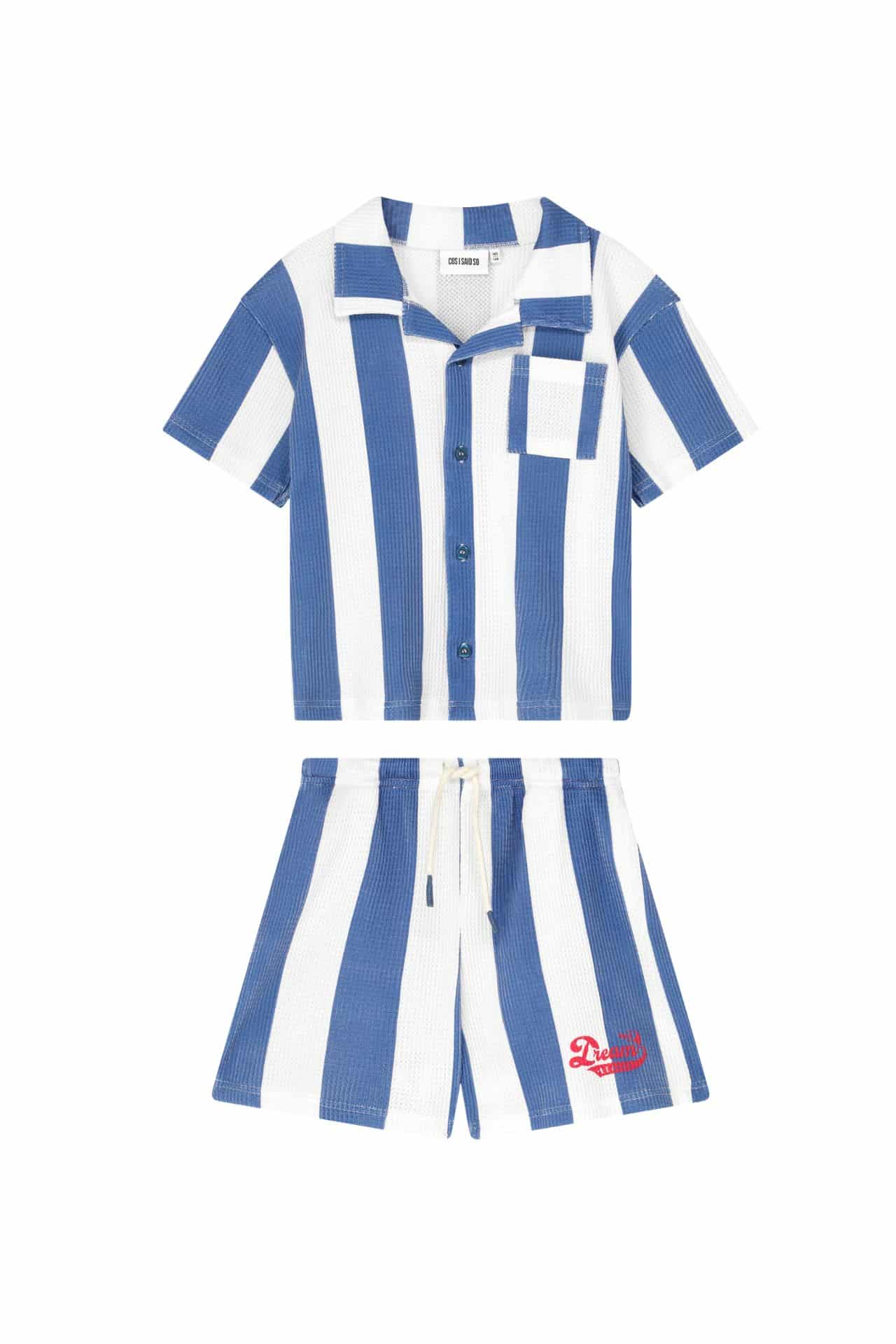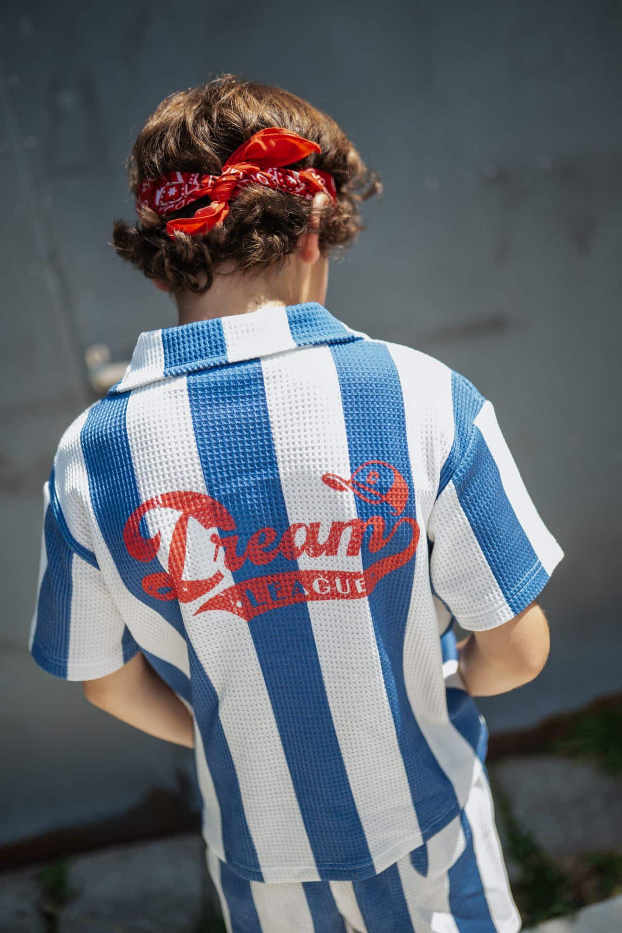 This two-piece kids set features a short-sleeve button-up shirt with a relaxed collar and a matching pair of elastic-waist shorts. The bold vertical blue-and-white stripes create a timeless sporty look, while the textured cotton piqué fabric adds structure and breathability. Signature “Dream League” prints on the back of the shirt and shorts add a playful, confident finish that sets this outfit apart.