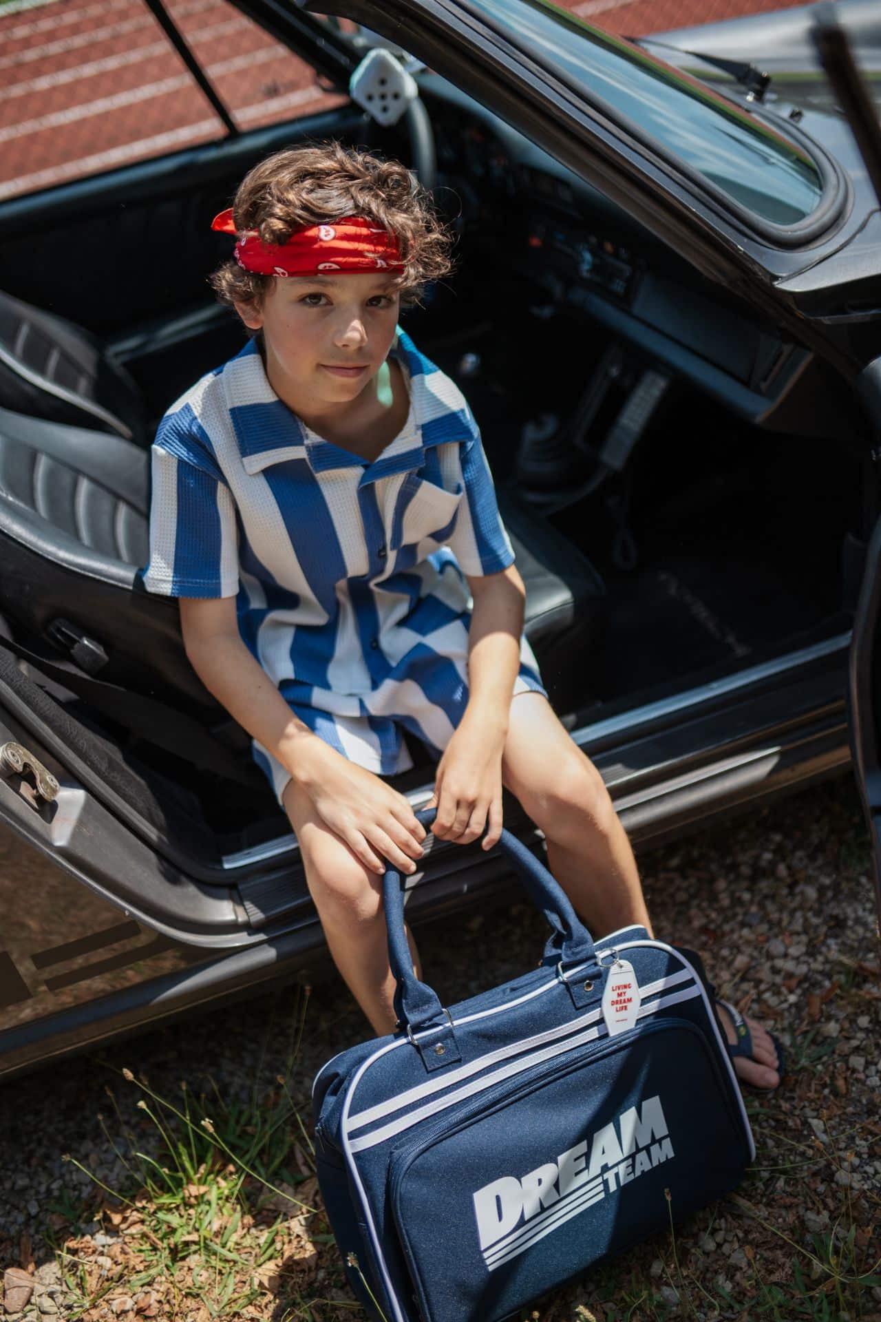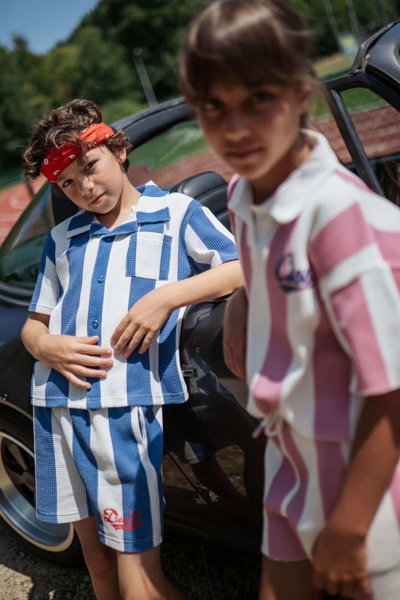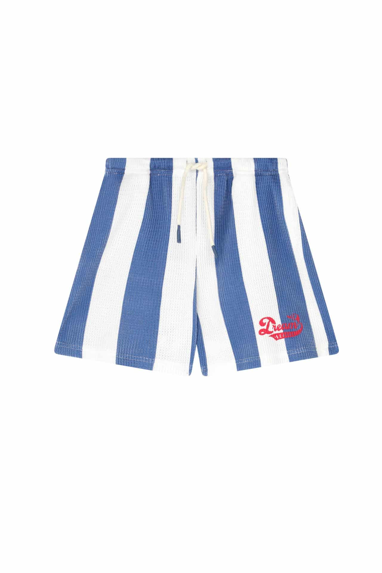 This two-piece kids set features a short-sleeve button-up shirt with a relaxed collar and a matching pair of elastic-waist shorts. The bold vertical blue-and-white stripes create a timeless sporty look, while the textured cotton piqué fabric adds structure and breathability. Signature “Dream League” prints on the back of the shirt and shorts add a playful, confident finish that sets this outfit apart.