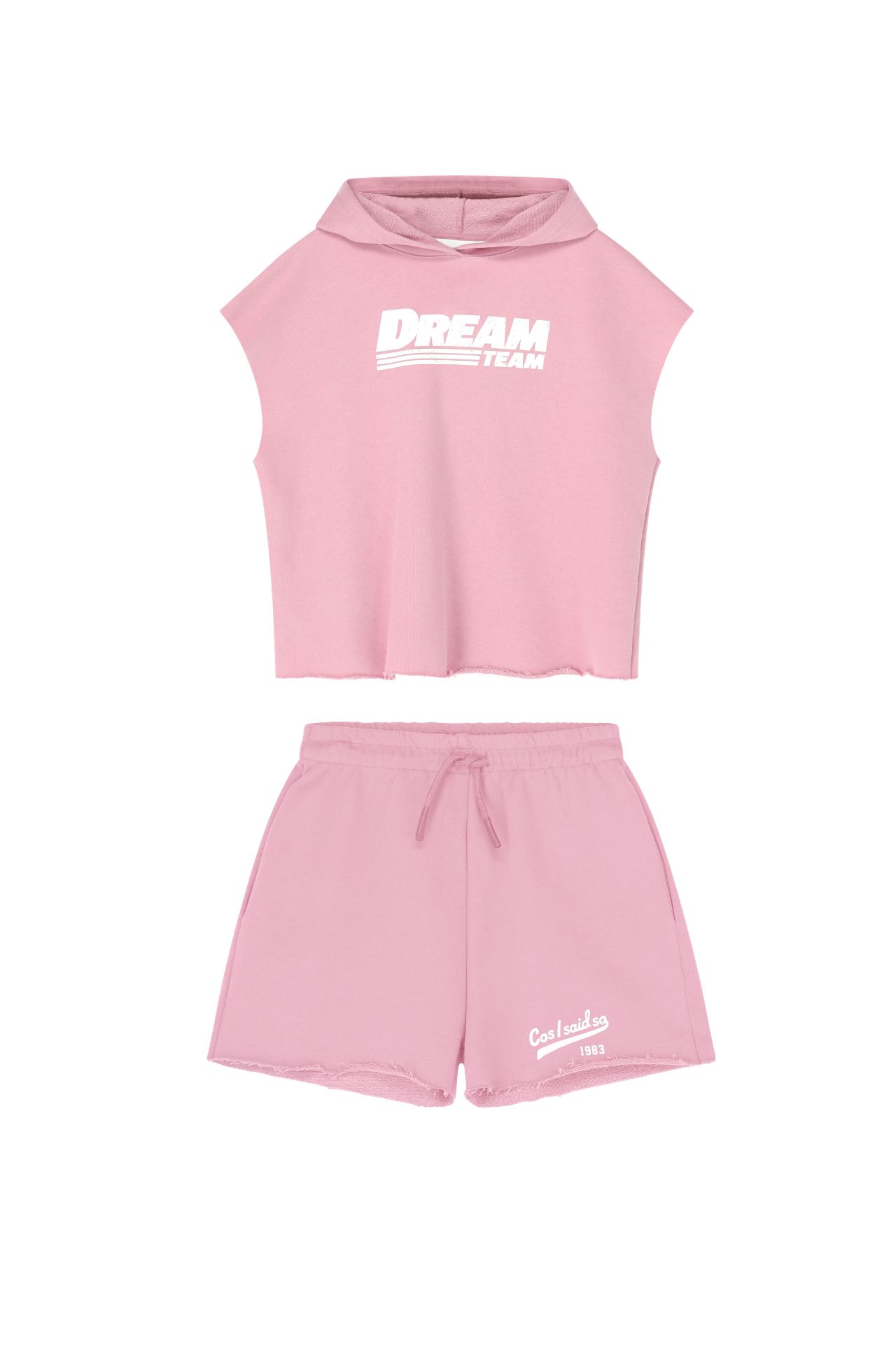 The kids hoodie shorts set by COS I SAID SO is a sporty summer outfit designed for comfort, movement, and effortless everyday style. Featuring a cut-off sleeveless hoodie paired with matching jog shorts, this Dream Team set is perfect for warm weather, active play, and casual outings.