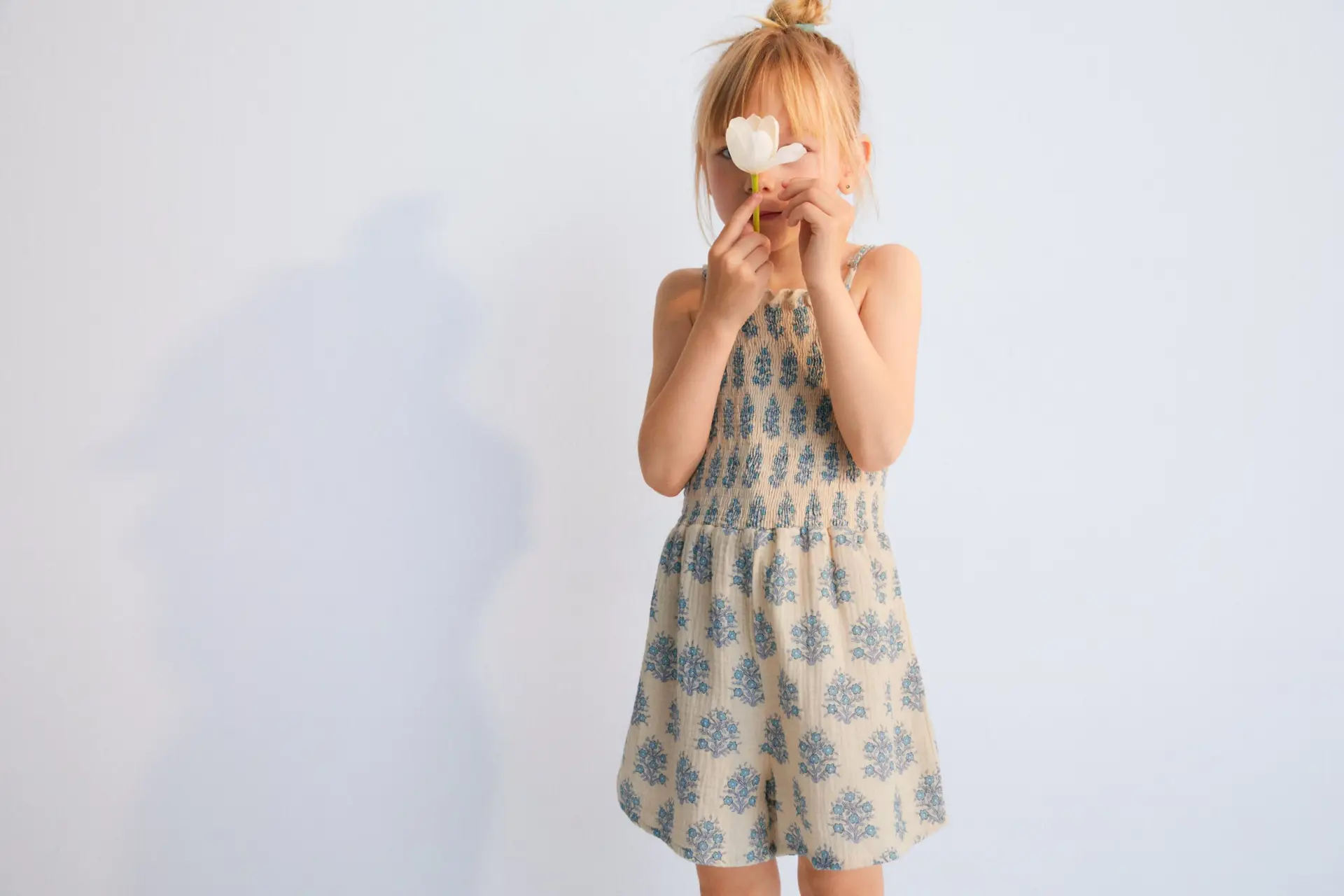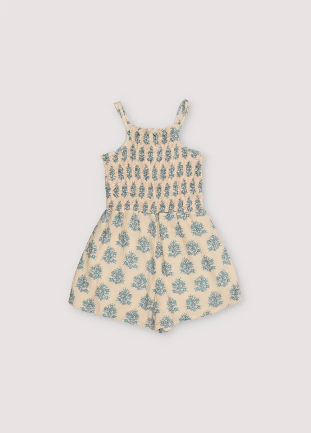 Kyra Jumpsuit in muslin fabric with our Lavender print. Jumpsuit with a smocked top and gathered pants creating the smocking effect for the upper part.