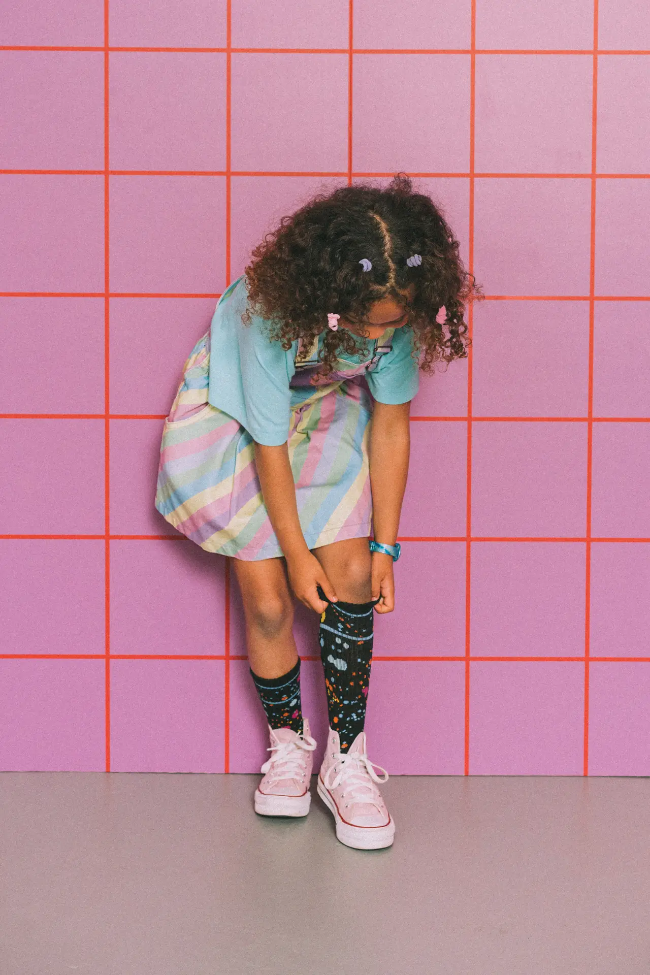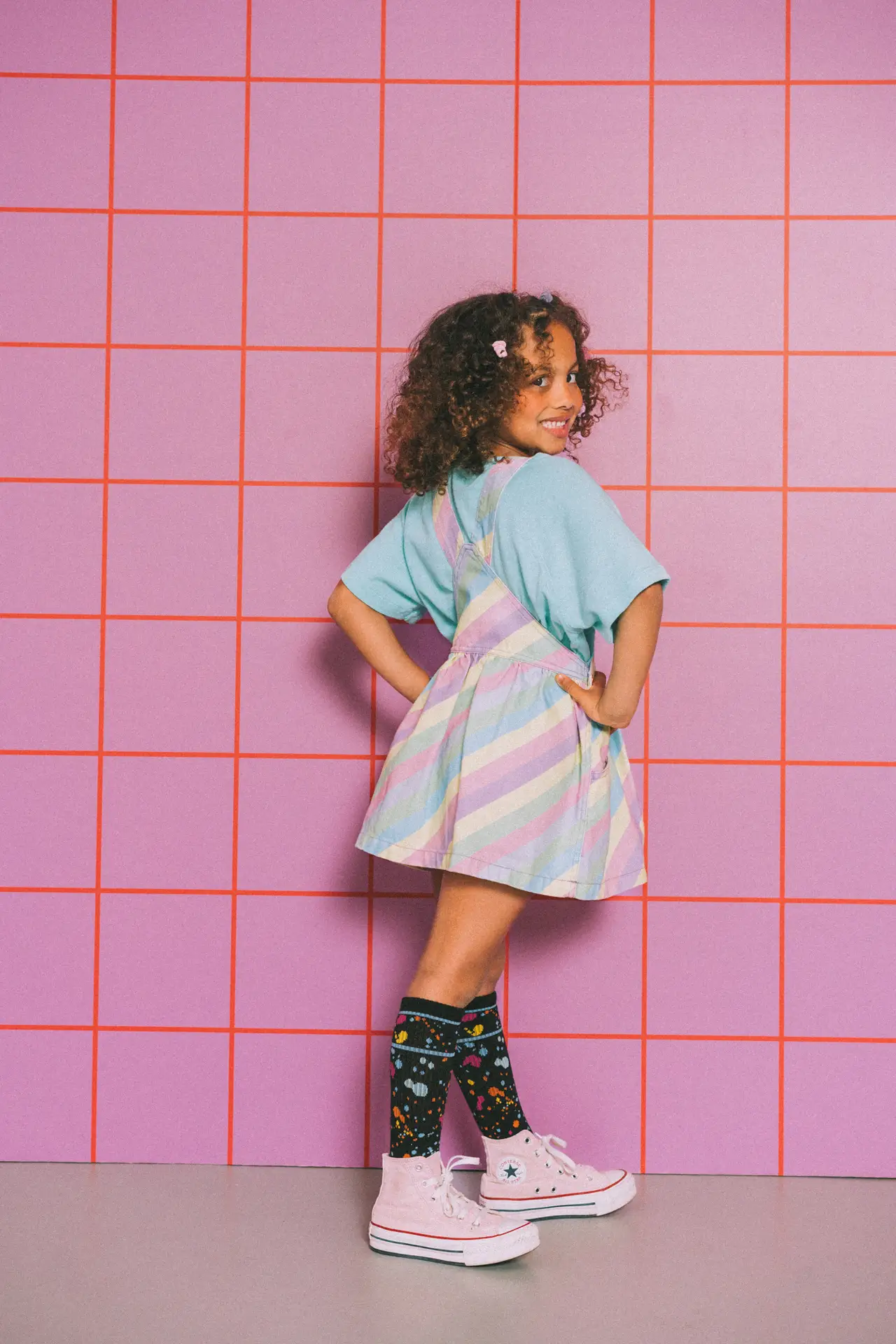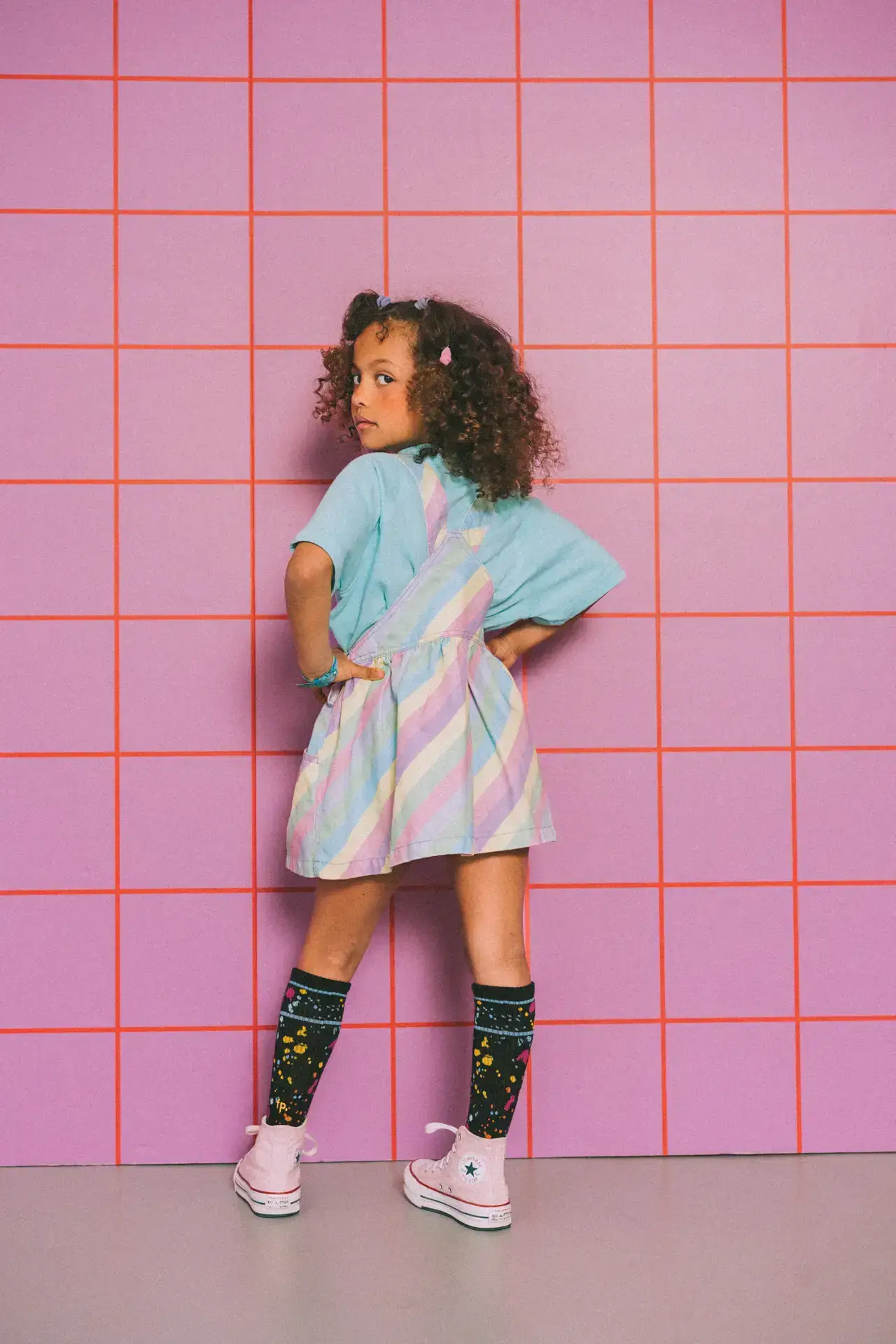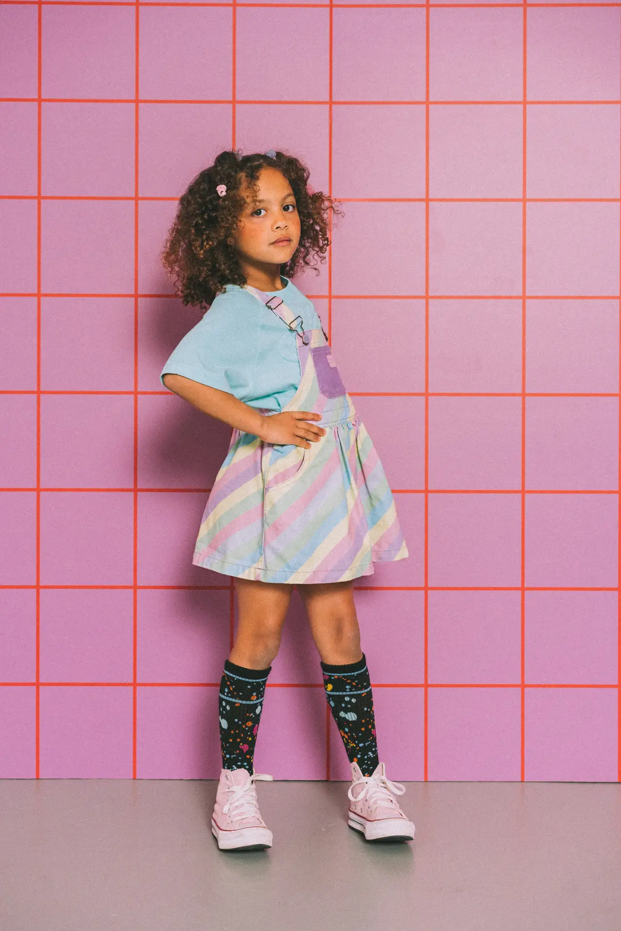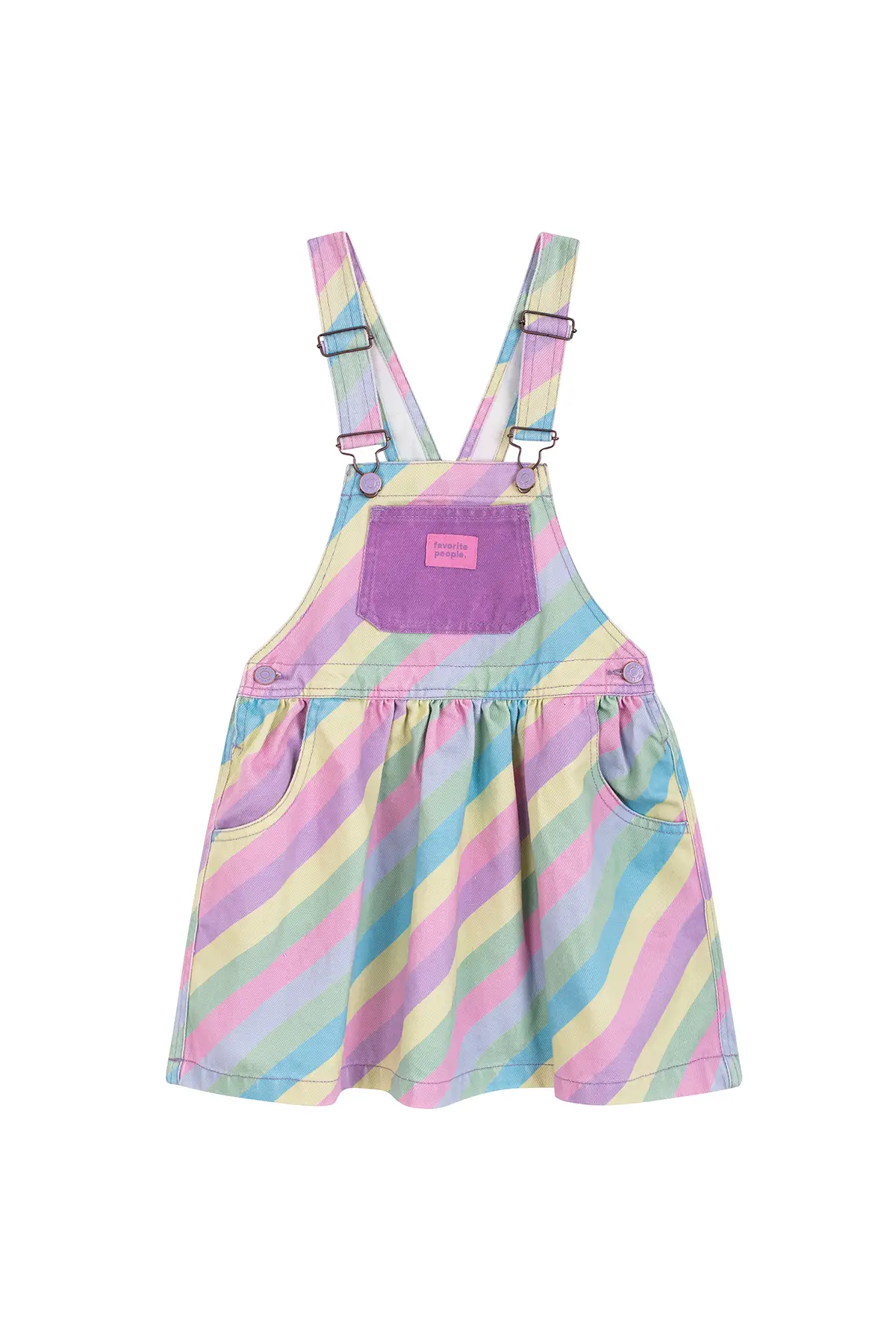 Skirt with multicolored stripes, a straight neckline and adjustable straps with dungarees closure. Combined pockets on the front, kangaroo-style on the bib and patch pocket on the back. Closure with buttons on the sides. | 100% cotton