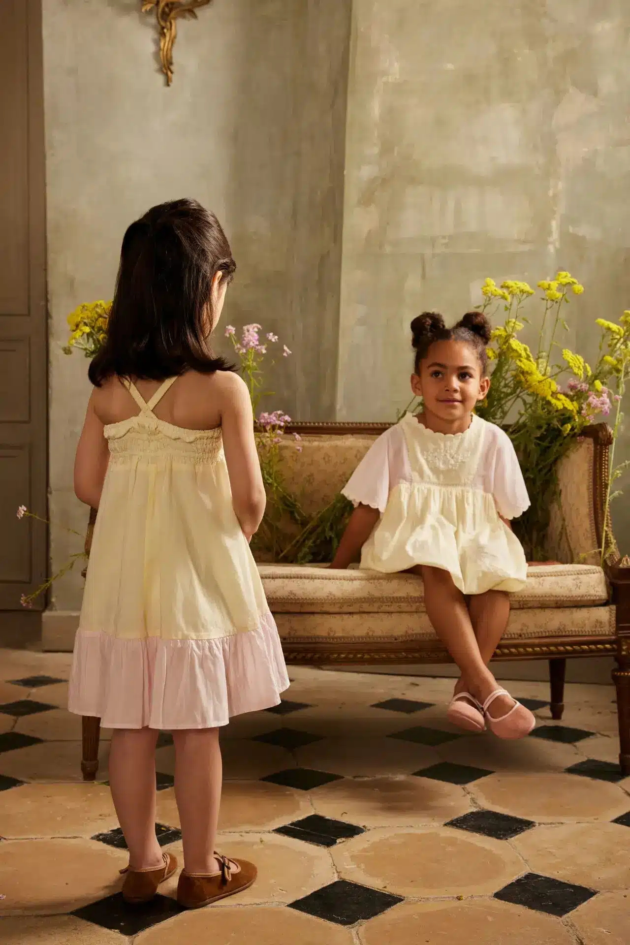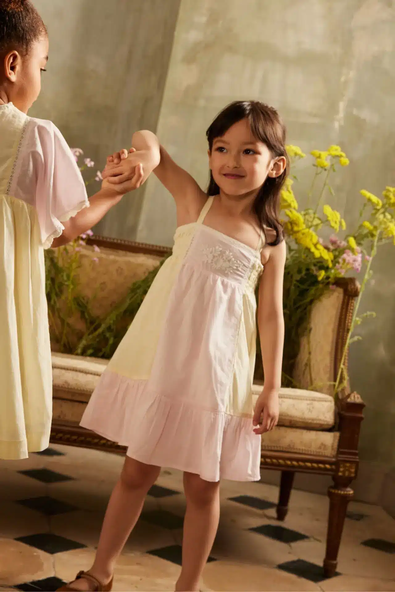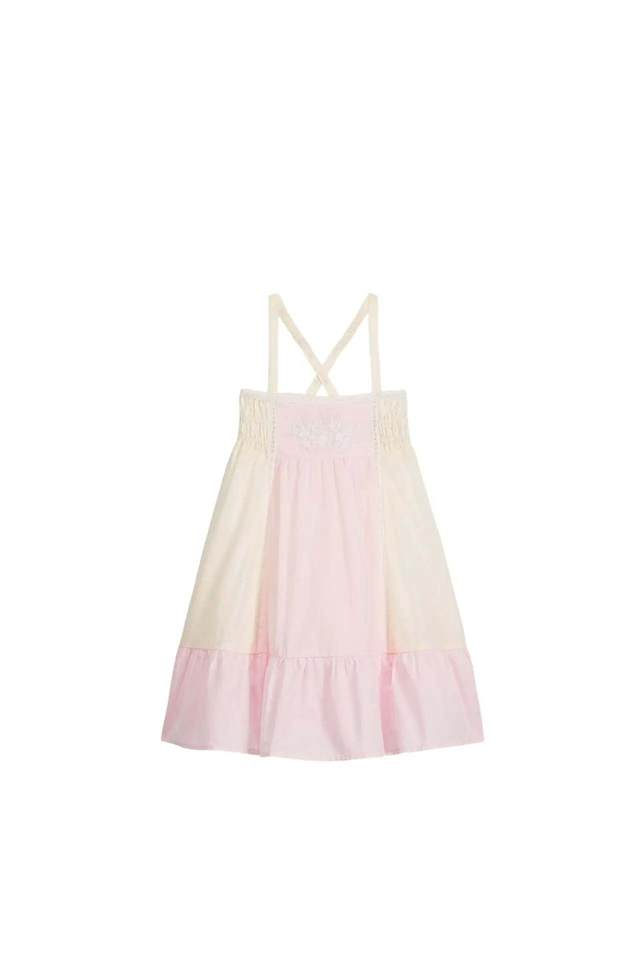 The beautifully crafted bodice features subtle embroidery and smocked detailing, offering both charm and comfort. The flowing silhouette with a gently gathered hem creates a light, airy movement, perfect for warm days and special occasions alike. Cross-back straps add an extra touch of sophistication, making it as stunning from the back as it is from the front.