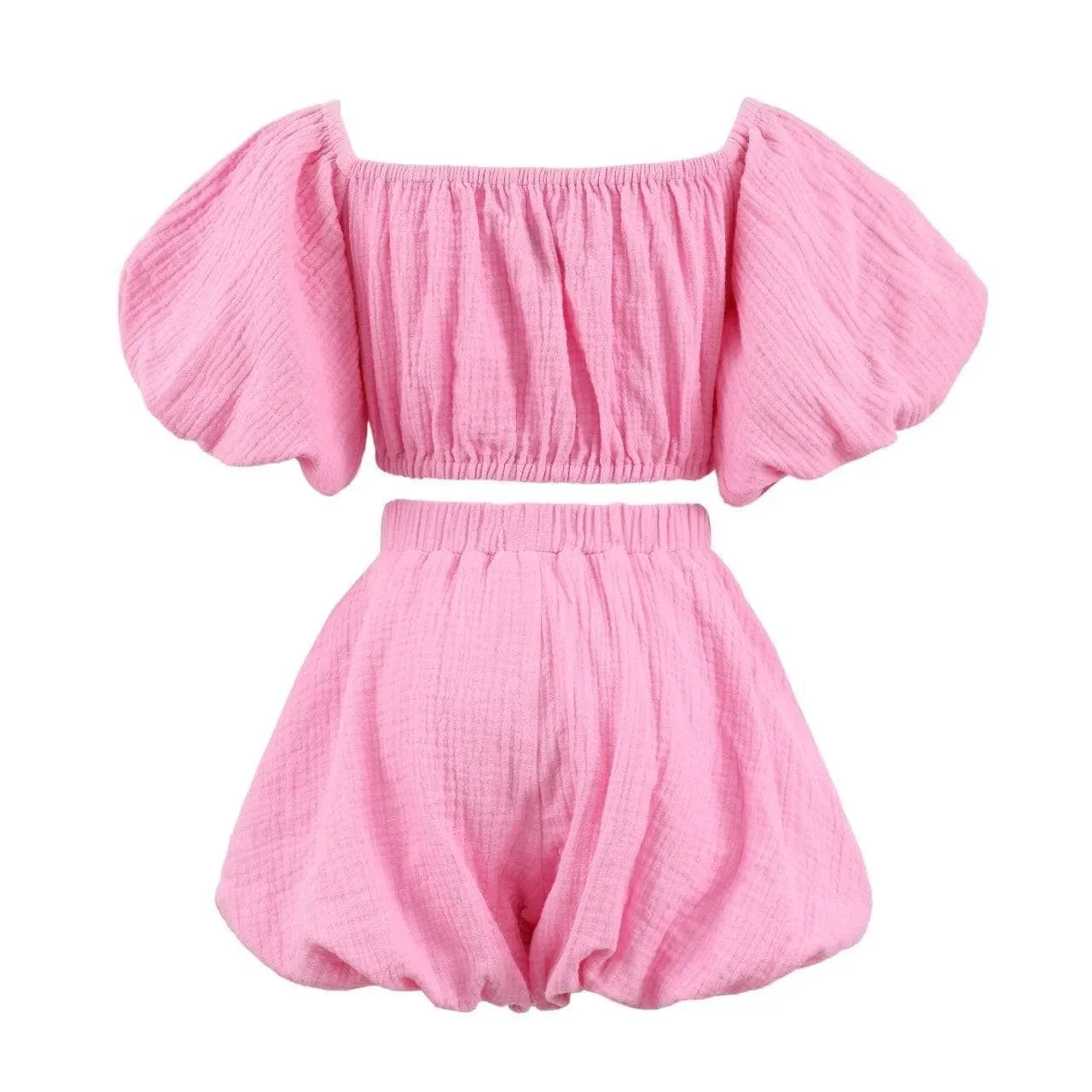 The Pink Hailey Bow Bubble Set is the perfect blend of playful charm and modern elegance. Designed in a beautiful soft pink tone, this two-piece outfit features a stylish puff sleeve crop top with a flattering square neckline, adorned with delicate bow appliqué details. It is paired with matching bubble-style shorts, creating a voluminous and fashion-forward silhouette.