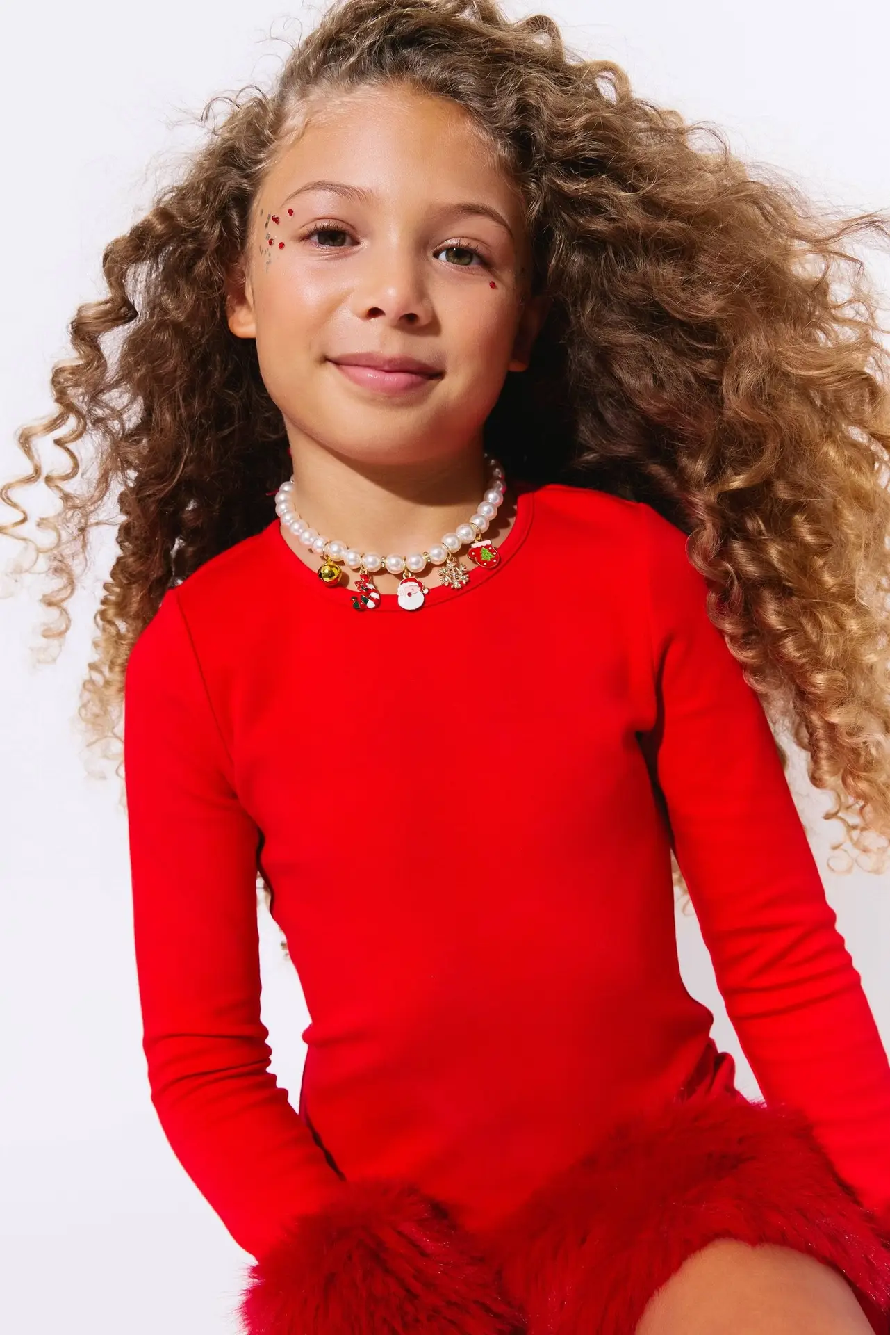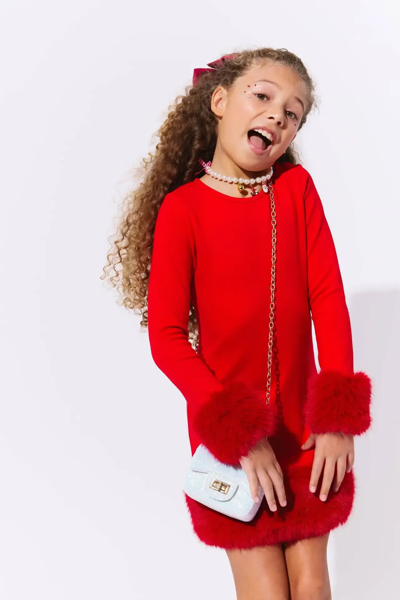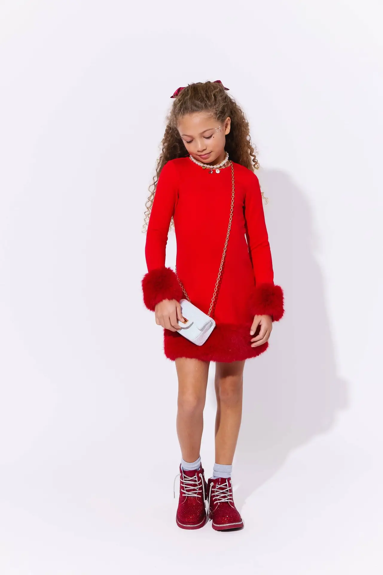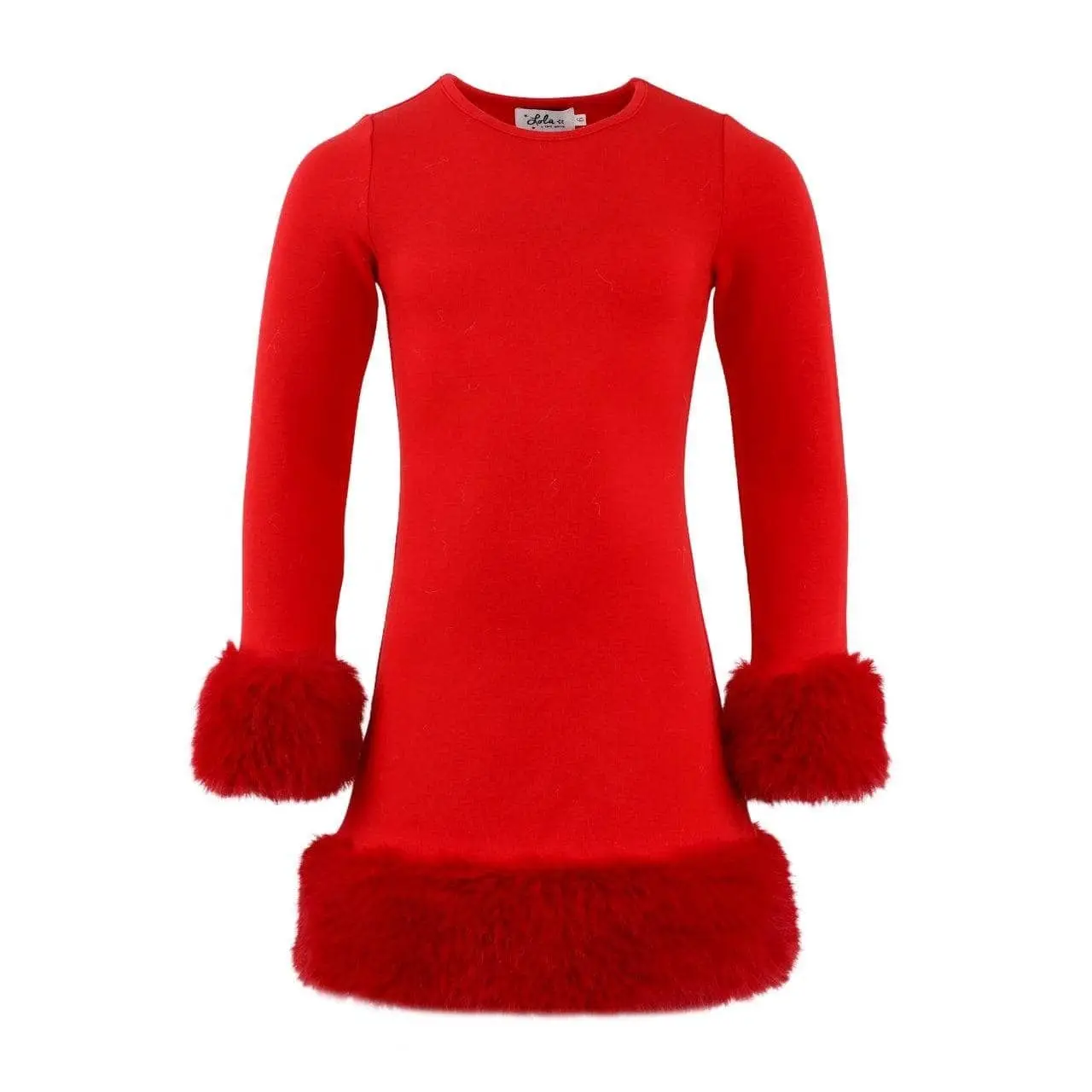 - This dress combines elegance with festive charm, featuring a bold red design adorned with plush faux fur trim on the cuffs and hem.