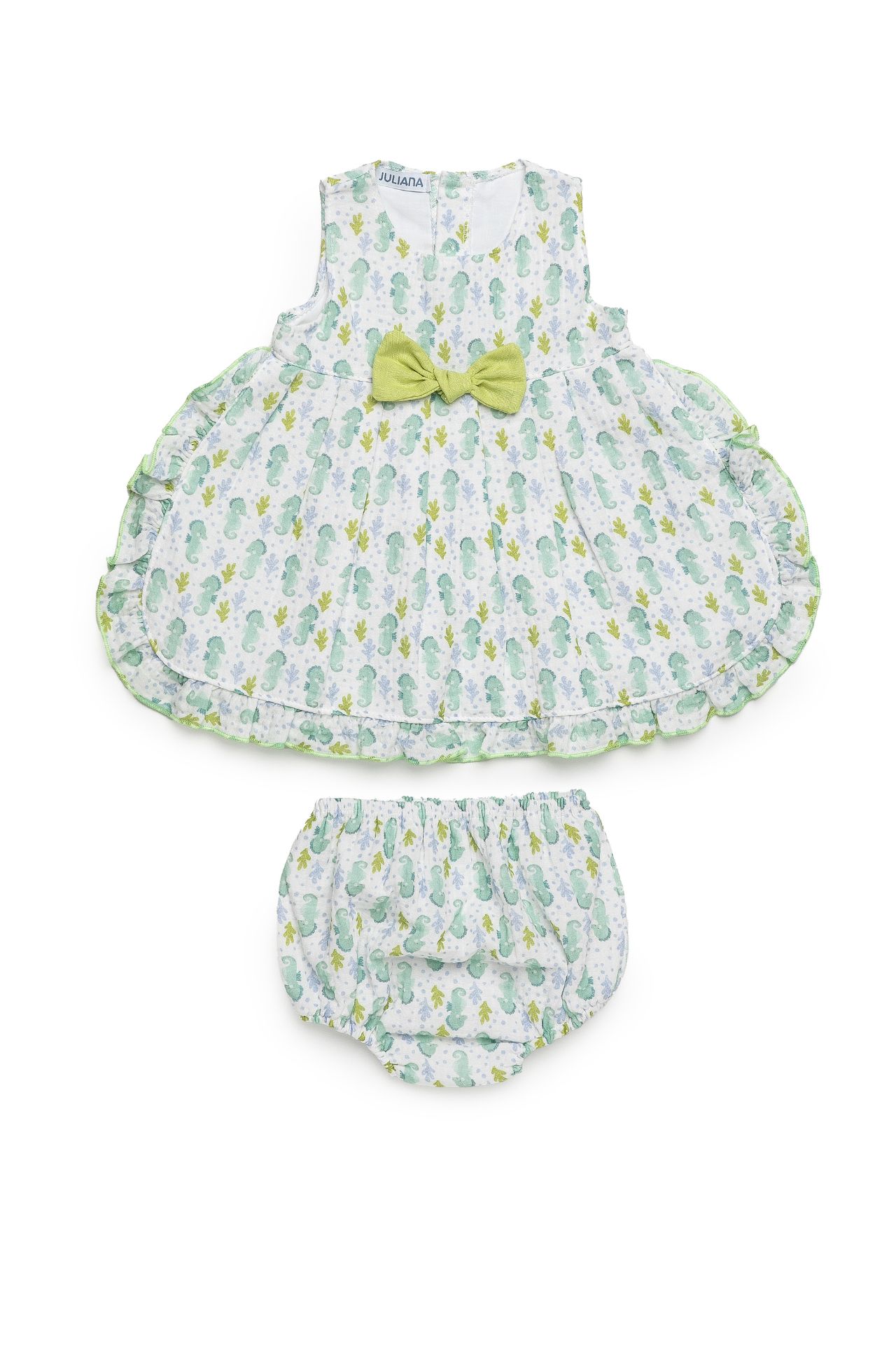 The dress features a lightweight fabric adorned with subtle seahorse motifs and soft natural tones, creating a fresh and airy feel. A statement bow at the front adds a refined focal point, while the ruffled edges enhance movement and elegance. The matching bloomers complete the outfit, ensuring both comfort and a coordinated finish.