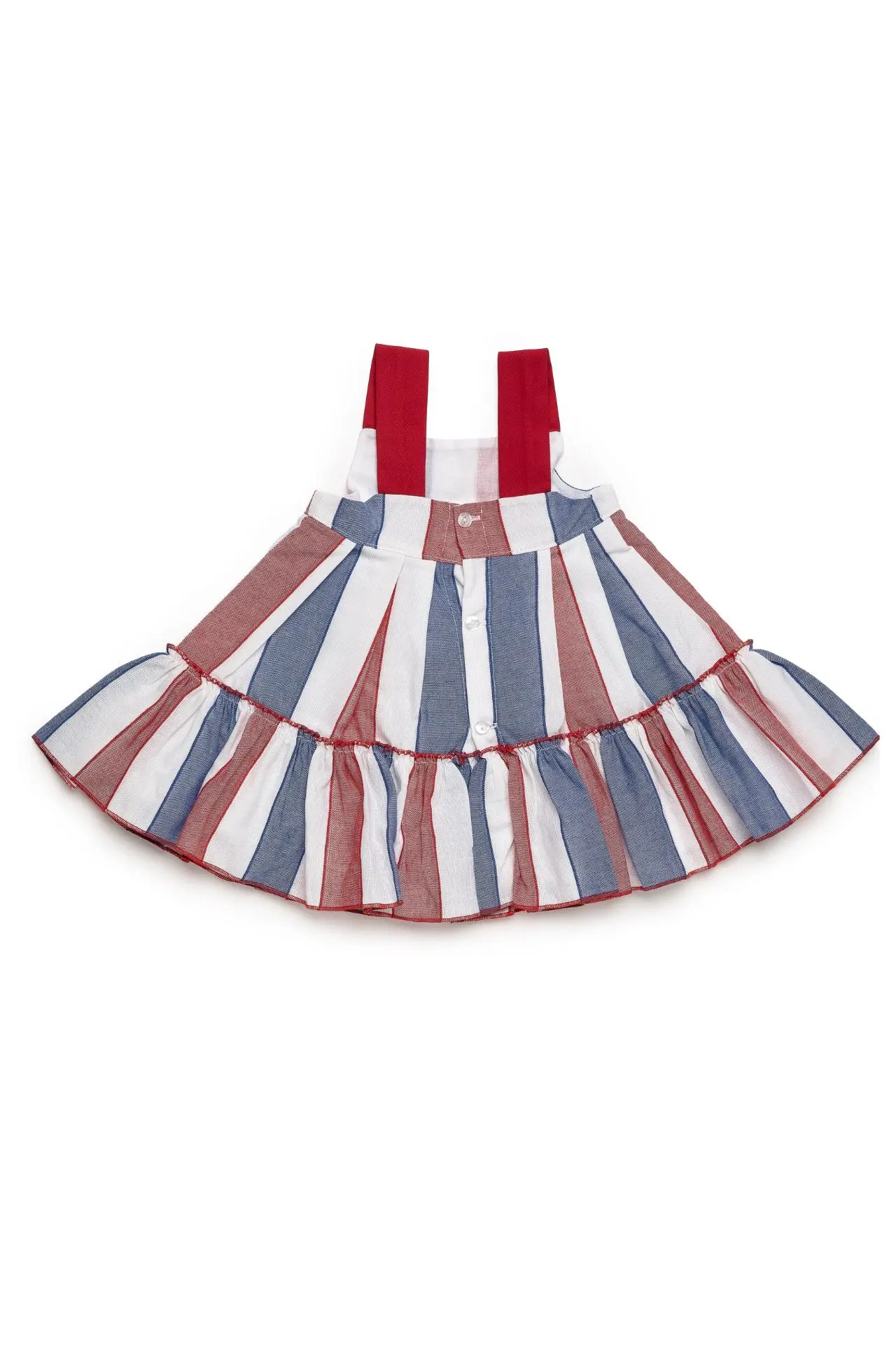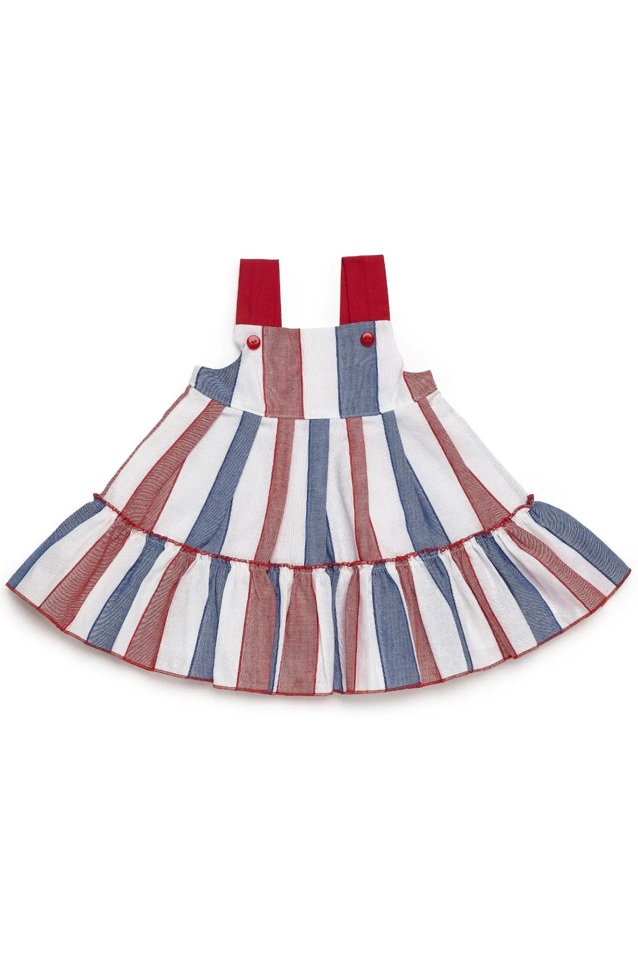 The dress features delicate vertical stripes in red, blue, and white tones, paired with structured shoulder straps for a secure and comfortable fit. The layered ruffle skirt adds volume and movement, giving the dress a lively and playful feel while maintaining a refined, classic aesthetic.