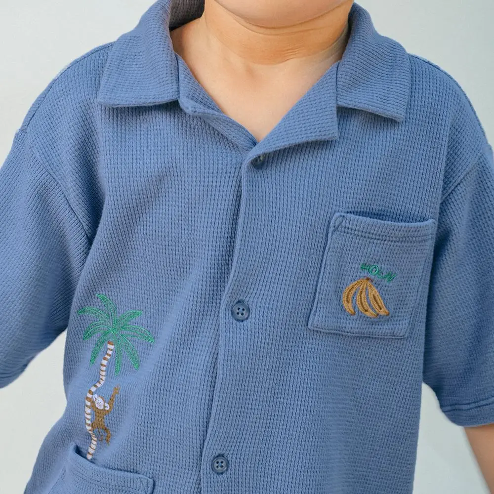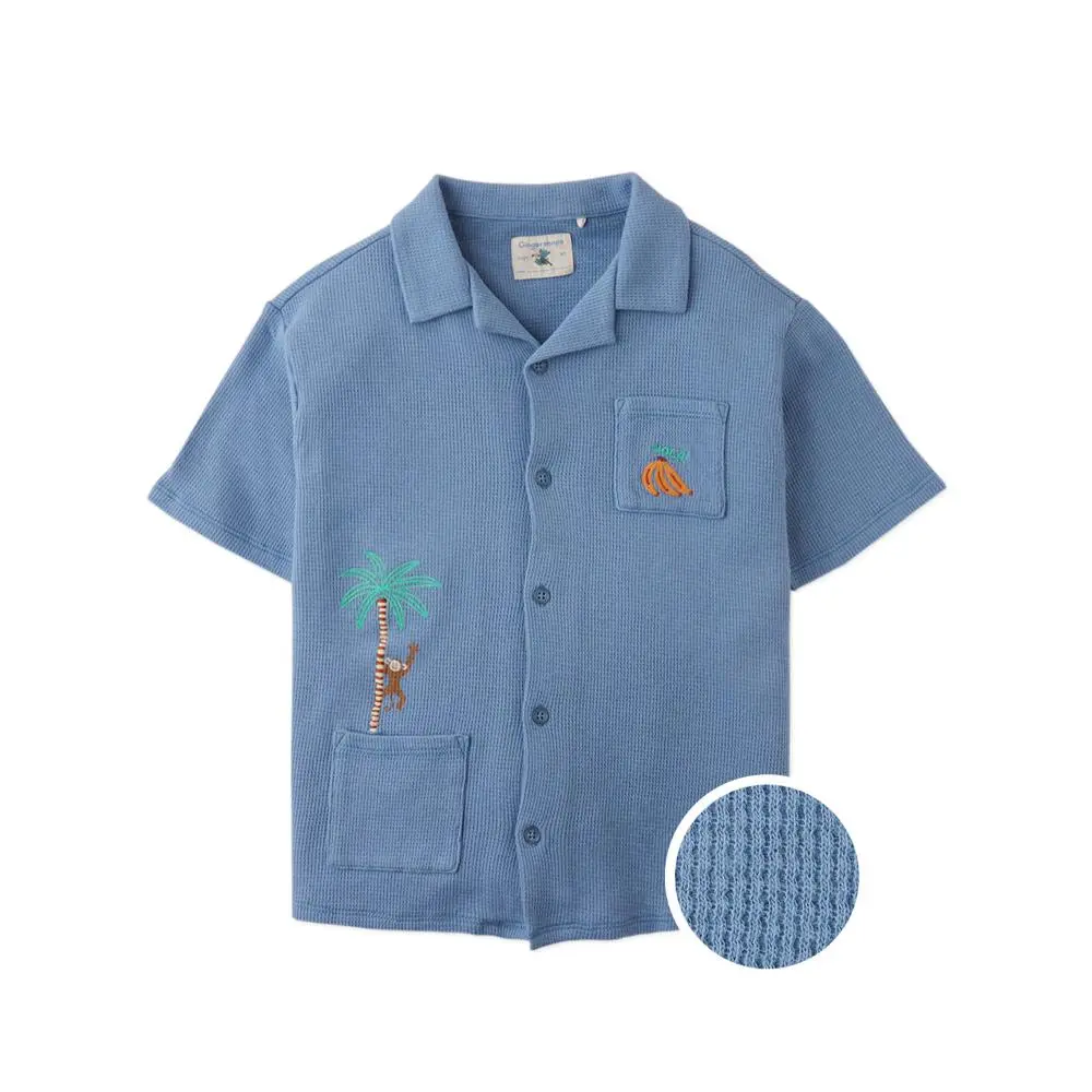Detailed with charming embroidery—including a palm tree and monkey motif and a small fruit accent on the chest pocket—this shirt adds a fun, tropical touch to everyday outfits. The relaxed fit and soft fabric make it ideal for both casual wear and slightly dressed-up occasions.