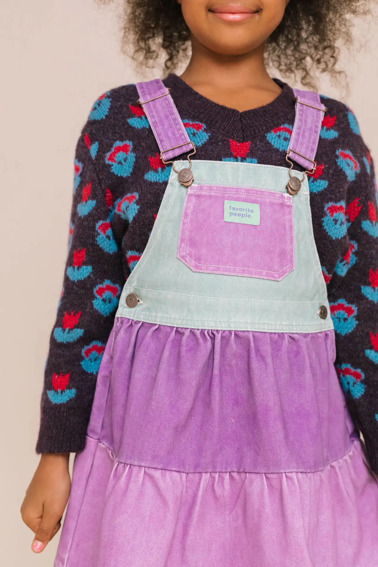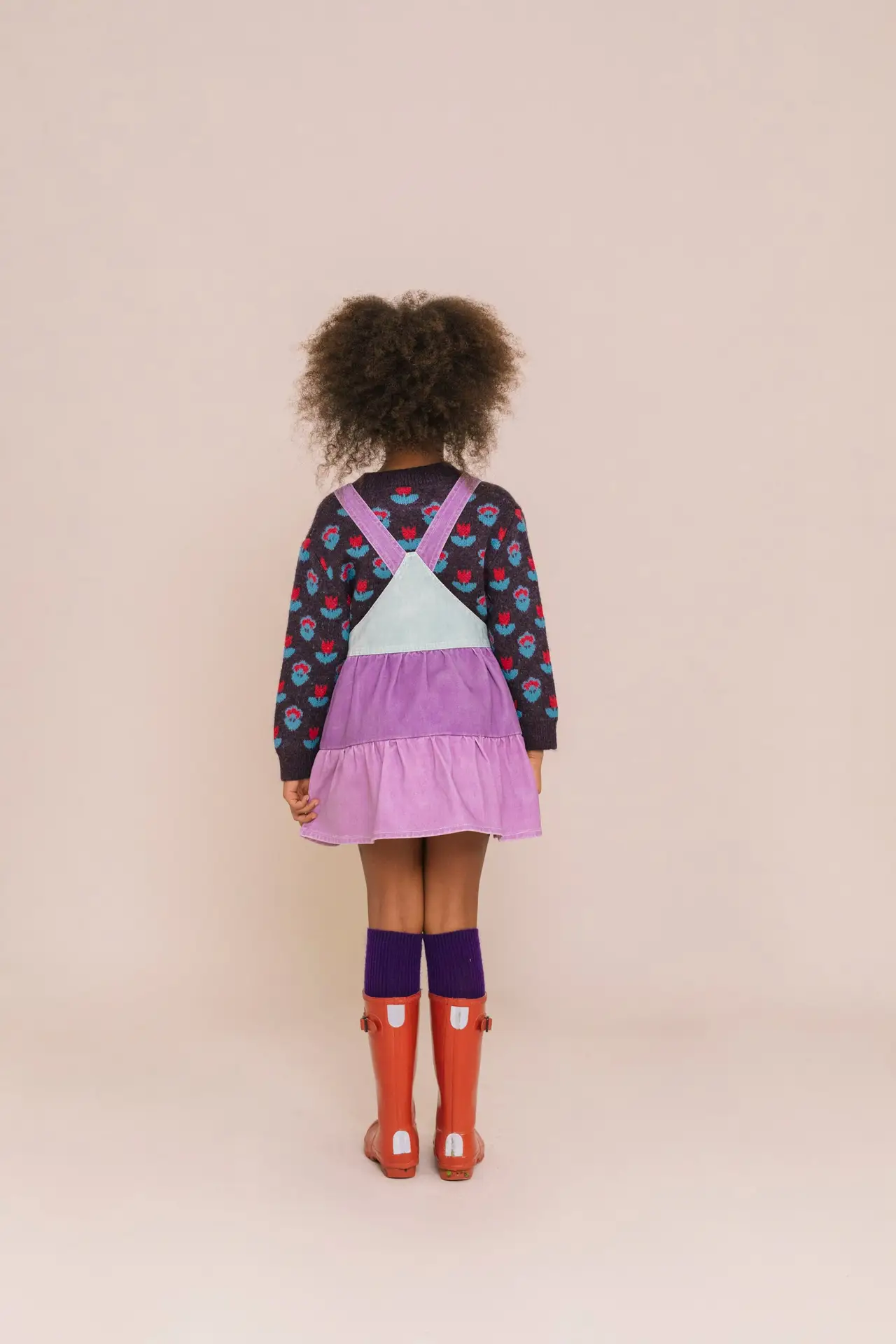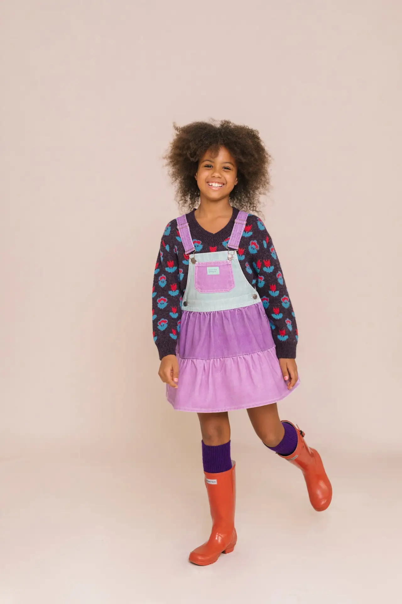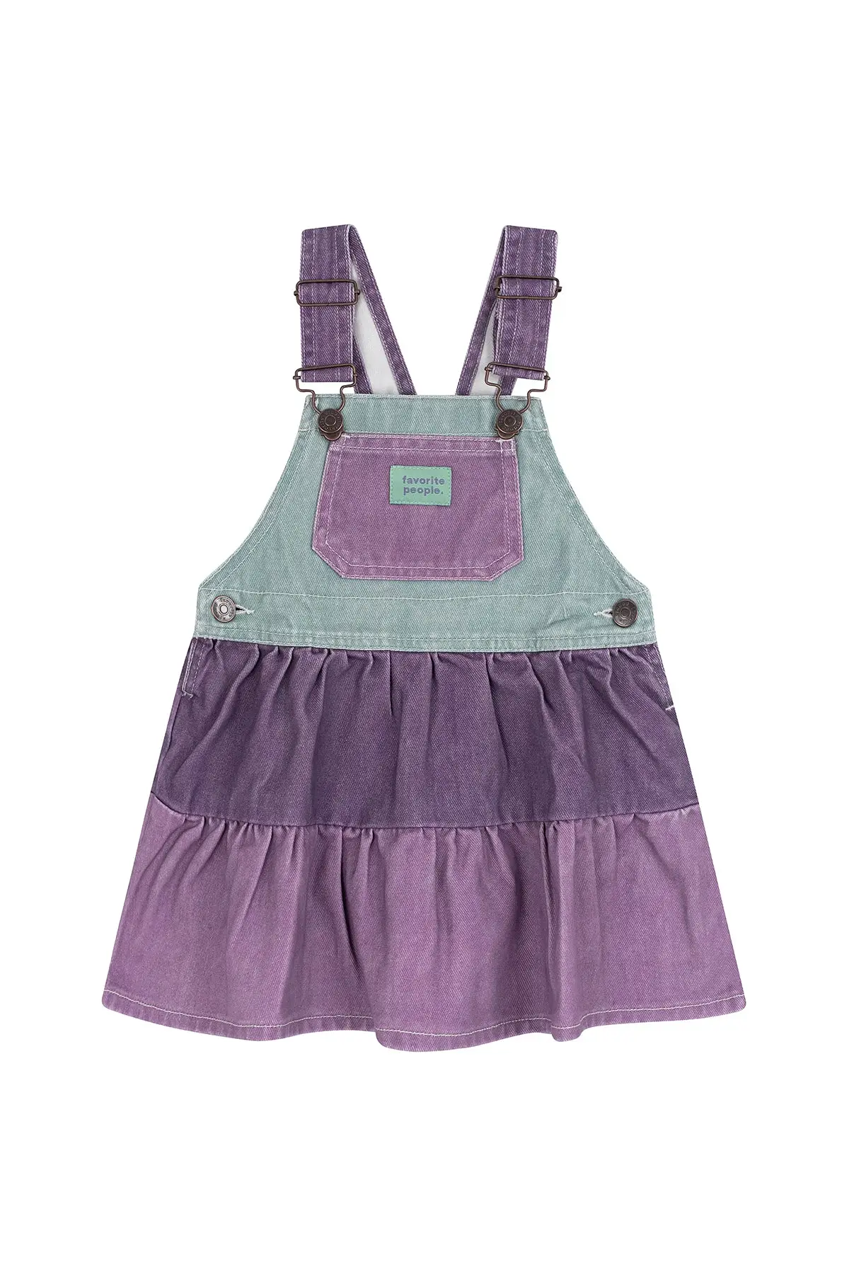 Blue, purple and lilac skirt overalls featuring a straight neckline and adjustable straps with classic dungaree closures. Designed with combined pockets, these overalls also showcase a standout feature: the playful 3-layer skirt, adding extra flair and movement.