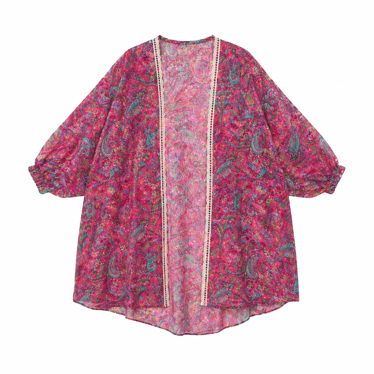 Featuring a vibrant paisley print in rich pink tones, this lightweight robe is designed for effortless layering. The relaxed silhouette and open-front design create a flowy, breathable feel, making it perfect for warm-weather days.